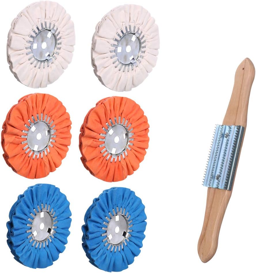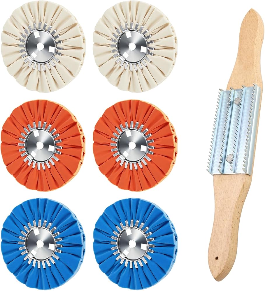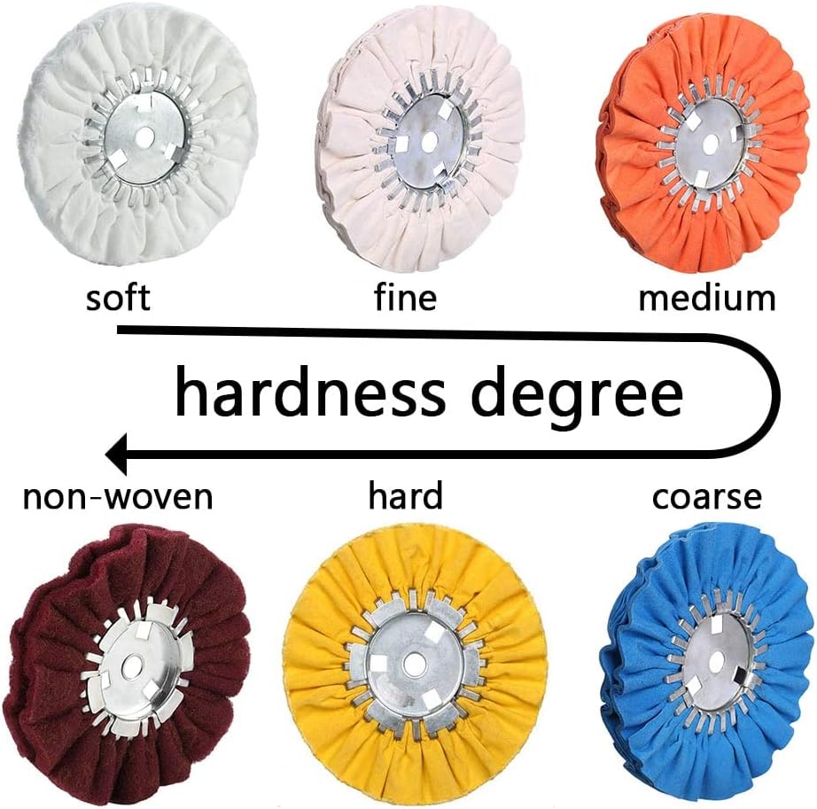 ※[Package] : This airway buffing wheels set contain 2 white airway buff of 16 ply for fine Polishing,2 orange airway buff 16 ply for middle polish ,2 blue airway airway buffing wheels 16 ply for coarse polishing, 1 buffing rake for cleaning polishing compound there are 3different airway buffing wheels together for different produce