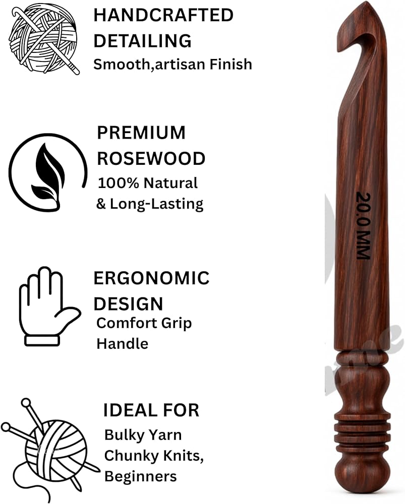 Handcrafted from Premium Rosewood – Each crochet hook is handmade from dense, durable rosewood with a smooth natural finish that glides effortlessly through chunky yarn, reducing wrist strain and enhancing control.
