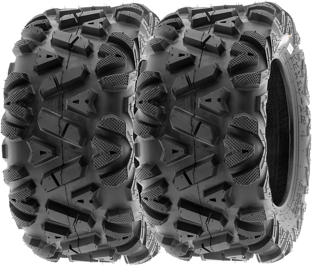 Directional angled knobby tread design great in most terrain with high performance on trails and suitable for desert, mud, dirt and rock applications. Features premium rubber in our hard compound to withstand the harshest racing conditions. A perfect replacement tire for your quad ATV, UTV, Go Kart, Golf Cart or Lawn Mower.Heavy 6 ply rated construction resists punctures and abrasions.Lug depth and pattern offers enhanced skid and traction control, great in cross country or desert conditions. Aggressive shoulder knobs provide superb side bite and traction with added protection to rim and sidewall. Trully a great ALL TERRAIN tire at an affordable price (compared to Bighorn).Rim(s) NOT included. Please see full description for specifications. Contact us with any questions or concerns!Size 1: 22x7-12 | Size 2: 22x10-12