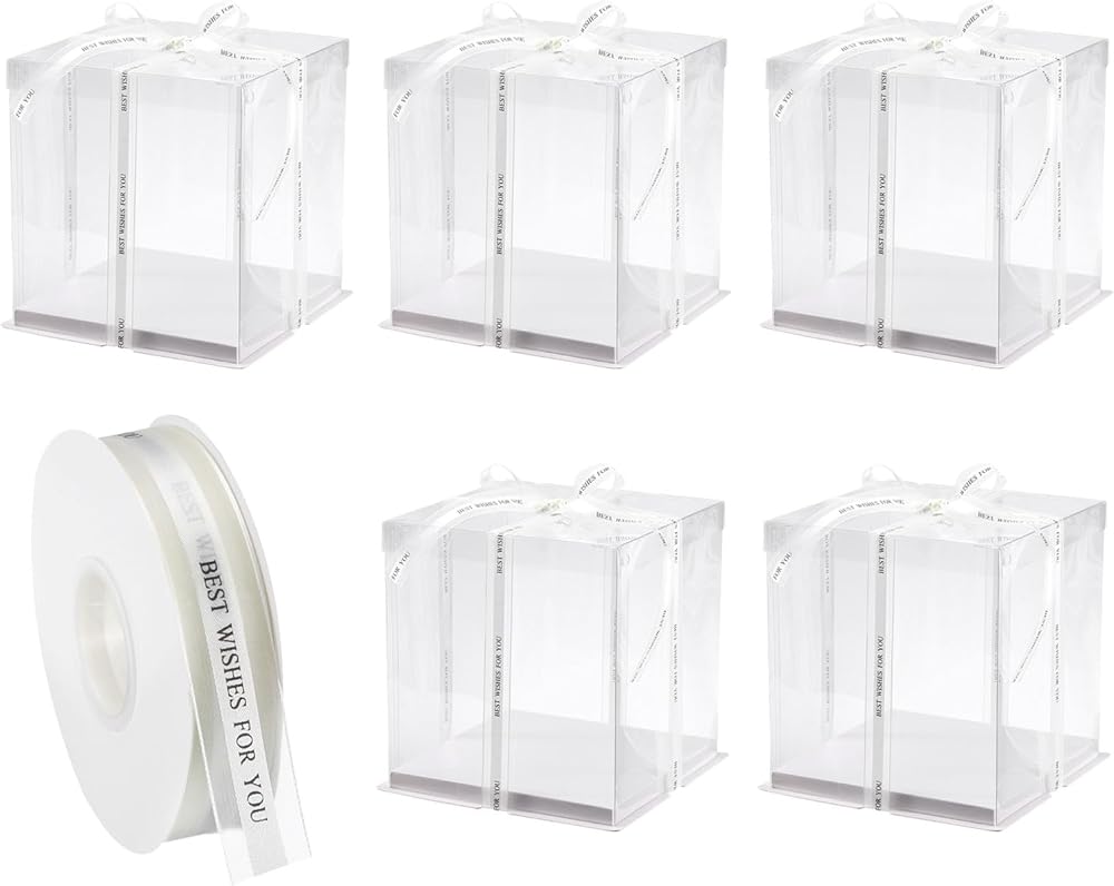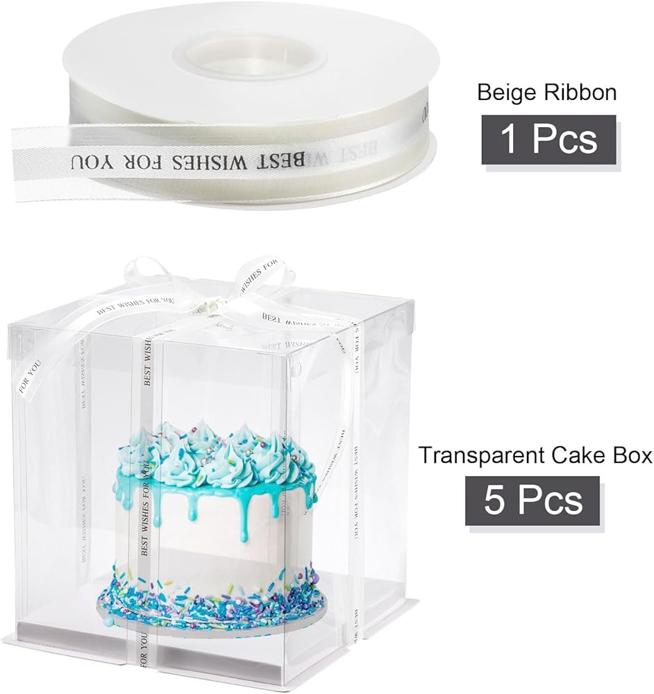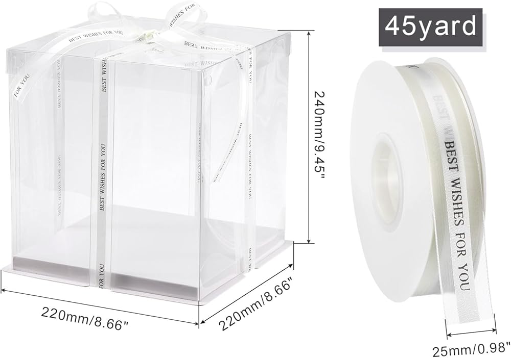 [Common Size] - This clear cake box has a length of 220mm, a width of 220mm, and a total height of 240mm, suitable for 6-inch cakes. It also includes a cake ribbon with a length of 45 yards and a width of 25mm.
