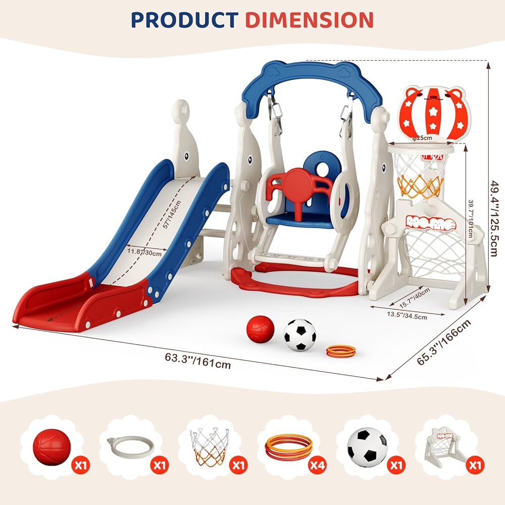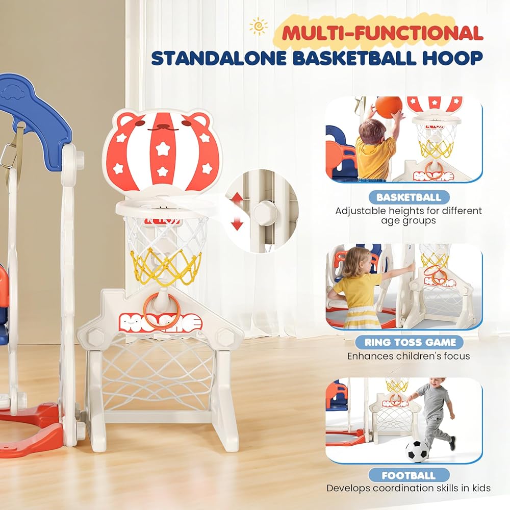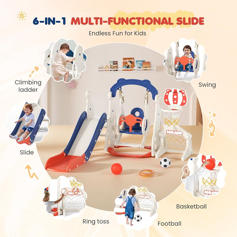 🎪 "Toddler Slide Playset New Upgrade" - Lischwert toddler slide incorporates 6 activity areas, Newly launched the Ring Toss and Soccer which parts others without, besides, the popular parts are also reserve, including slide way, swing, climbing, adjustable toddler basketball hoop, Our toddler slide outdoor play set helps kids to develop skills, promote fitness, balance and enhance the friendship while kids have fun