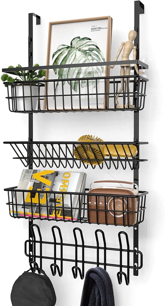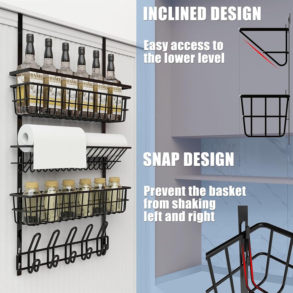 ANSTEEP Over The Door Organizer with Hooks, Door Towel Holder with 3 Baskets and 5 Hooks Hanging Storage Shelves Spice Racks for Bedroom, Kitchen,Bathroom