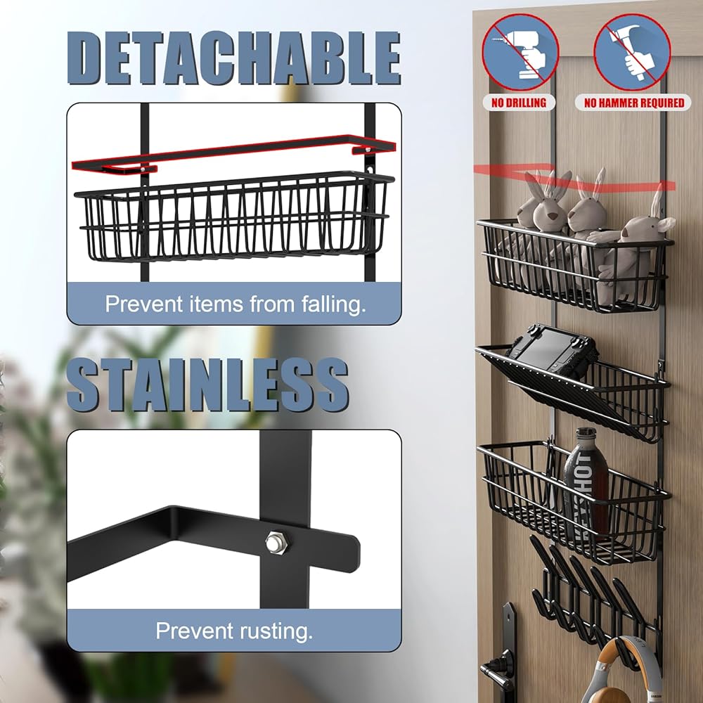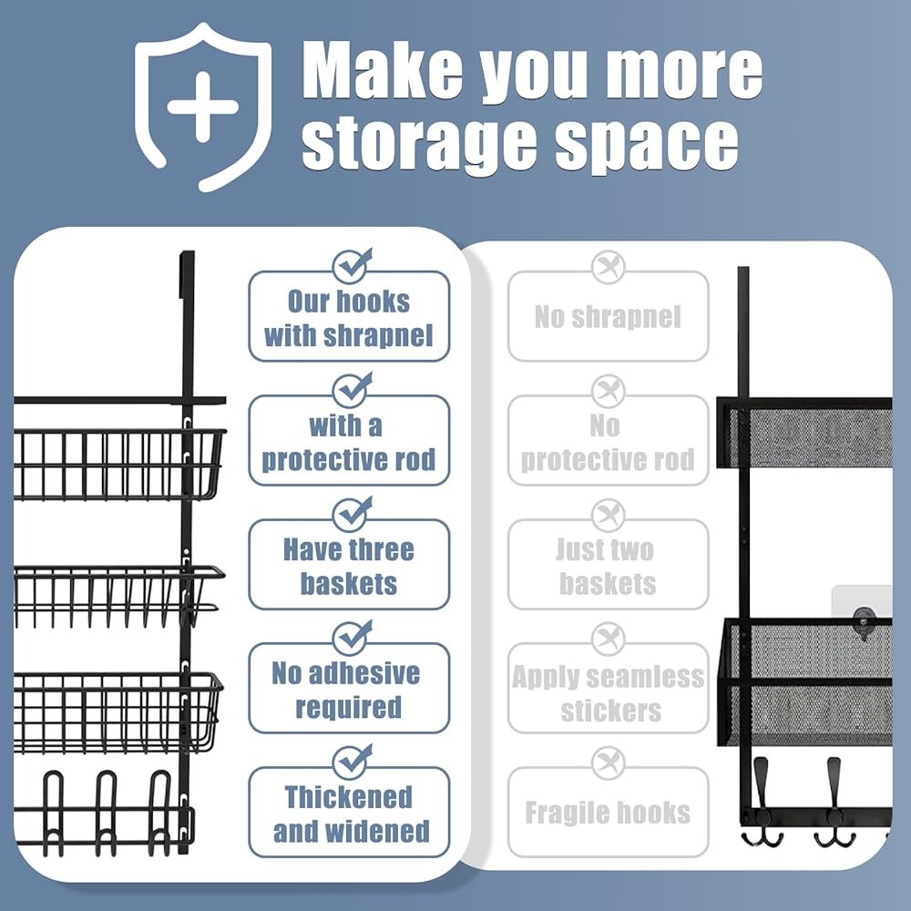 【Structural Design】 - The top basket is equipped with a protective rod to prevent items from falling off due to the door switch, and the middle basket is designed to be inclined to facilitate the taking of items. Our over the door hooks can be used for a longer time.