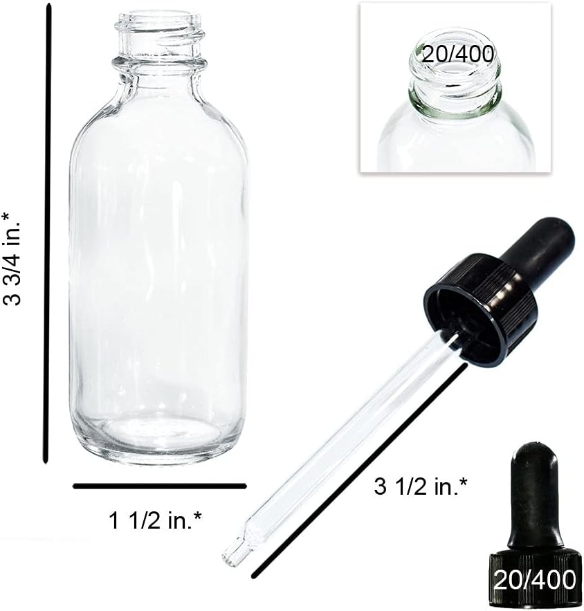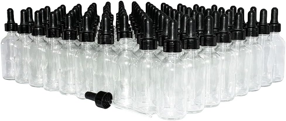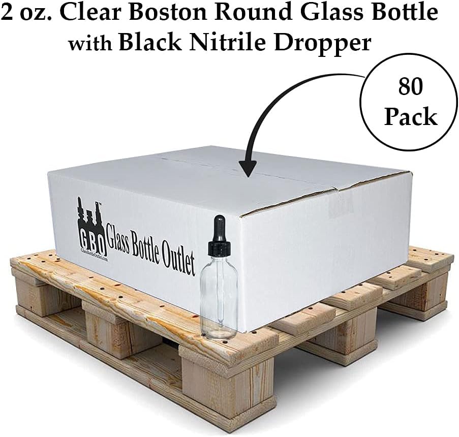 (Pack of 80) 2 oz. clear Boston round glass bottles with black glass droppers