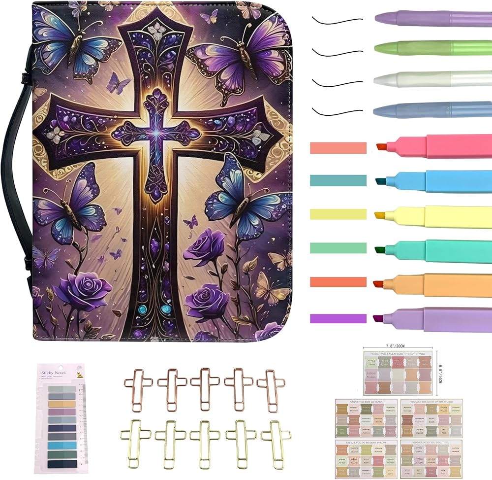 1. Sold as a set, includes 6 colored markers, 4 ballpoint pens, 5 Bible index labels (15 stickers per label, 75 stickers total, Bohemian style), 10 metal cross paperclips bookmarks, and 1 sheet of loose-leaf sticky notes (10 colors, 20 sheets of each color, 20 notes total).