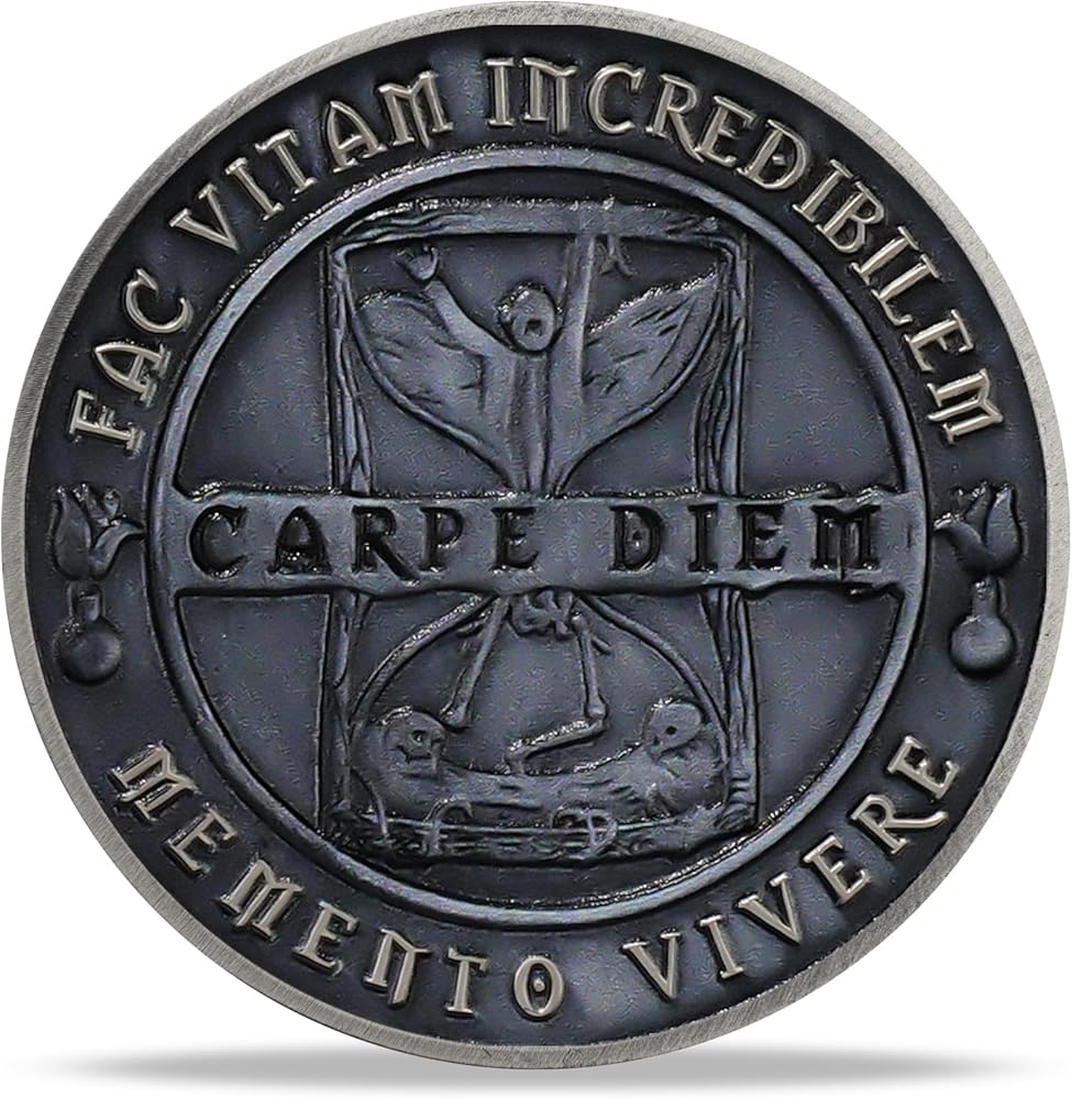 Inspirational Reverse Design: The reverse side of the edc coin showcases a funnel, with the phrase “Carpe Diem” (“Seize the Day”) etched nearby. This design emphasizes the importance of making the most of every moment, reminding you to live fully and seize opportunities before time runs out