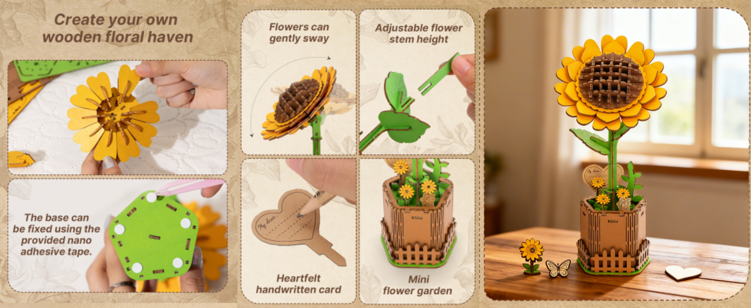 【Enjoyable Assembly Process】:Enjoy the comfortable assembly of this 3D wooden puzzle set, crafted from premium eco-friendly wood with smooth laser-cut precision. Tailor the height of each flower to your liking, designing infinite floral possibilities that ignite creative joy and provide a deeply soothing, therapeutic experience.