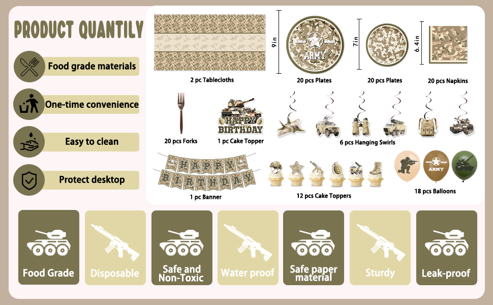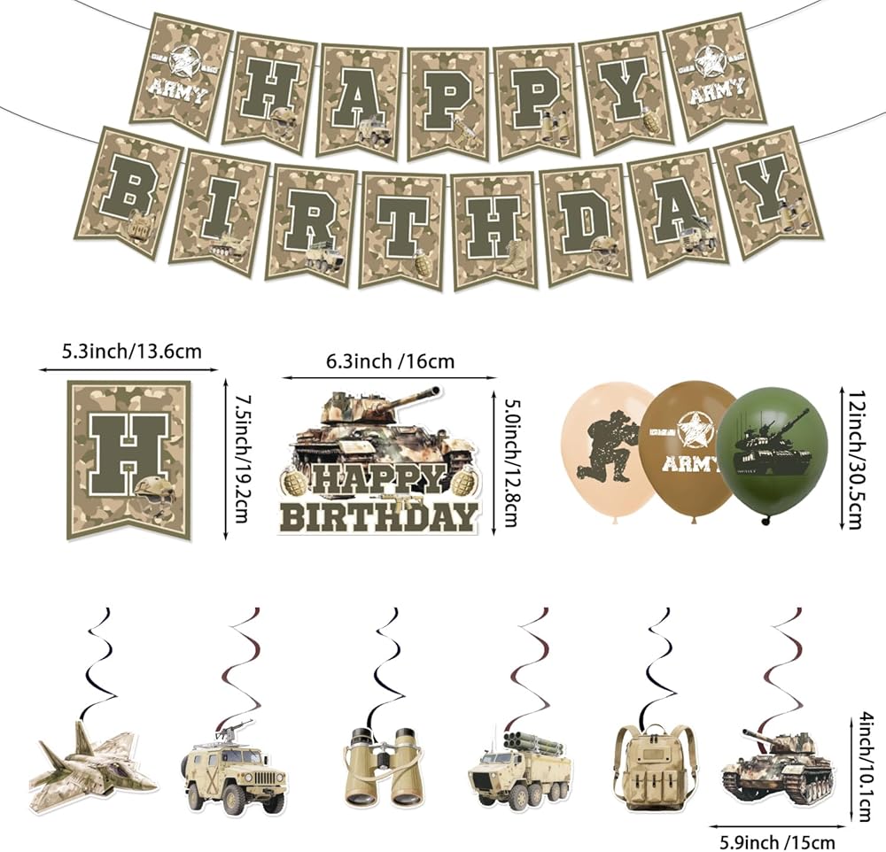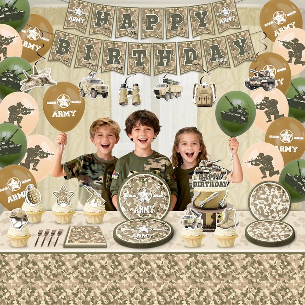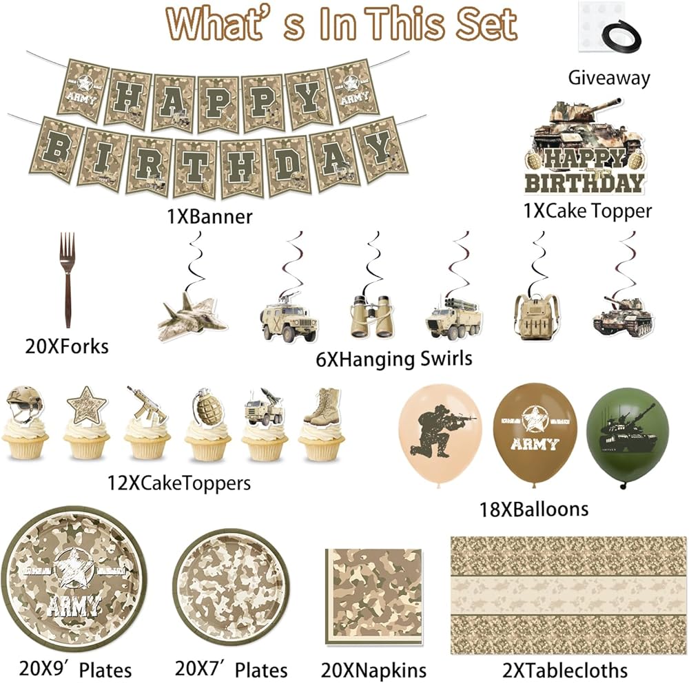 Army Birthday Party Decorations, Camo Party Decorations for 20 Guests with Banner, Balloons, Hanging Swirls, Tablecloths, Plates, Napkins, Forks, Cake Topper, Cupcake Toppers