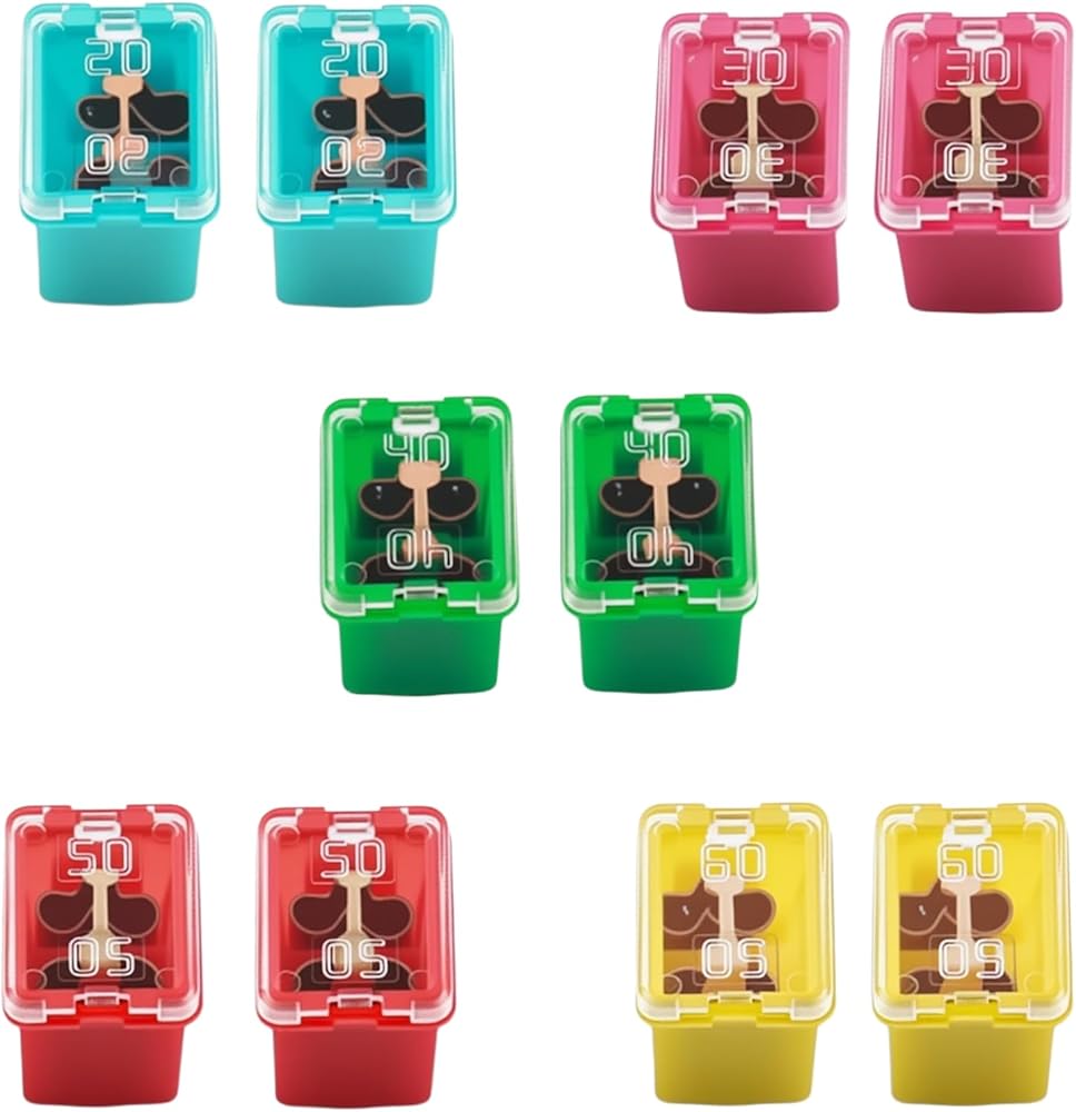 Products include: You will receive a set of car body fuse combination kit containing 10 fuses. There are two specifications for you to choose from: square long pins and square short pins. The rated currents are 20A, 30A, 40A, 50A, and 60A, which is sufficient to meet all your needs