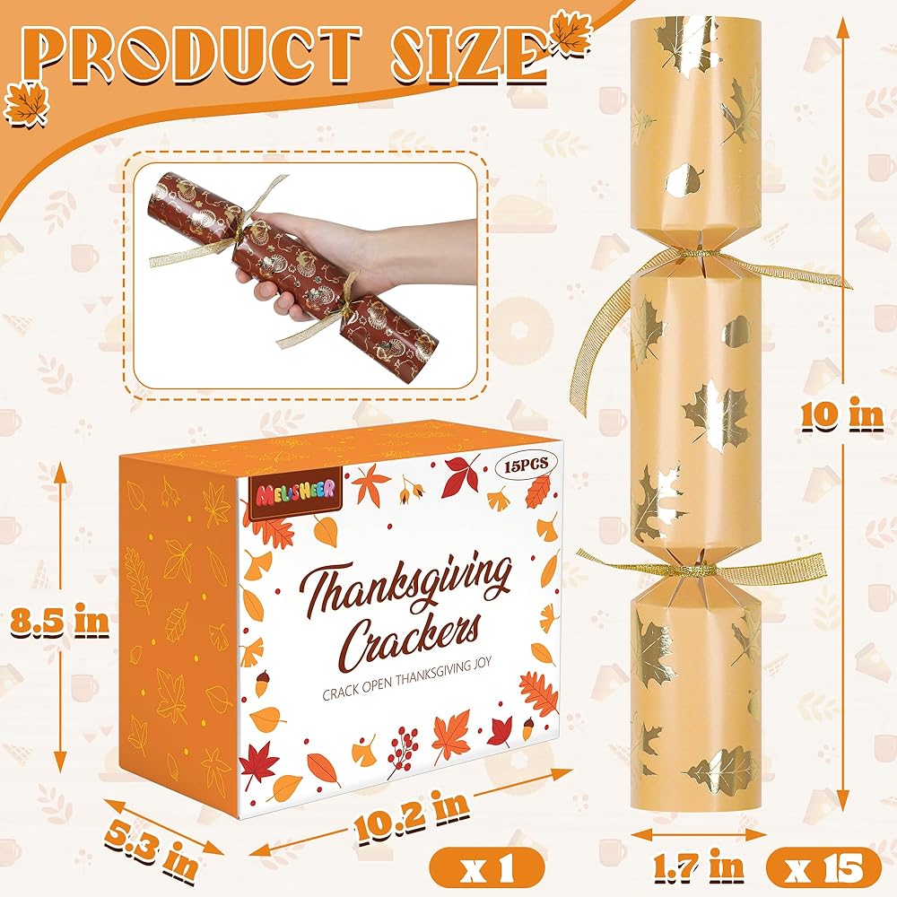 In the Package: Our Thanksgiving party crackers are exquisitely packaged, featuring 15 unique pieces that stand 10 inches tall and 1.7 inches wide. These delightful Thanksgiving poppers are designed to bring families together through engaging games, creating a festive atmosphere during your holiday celebration