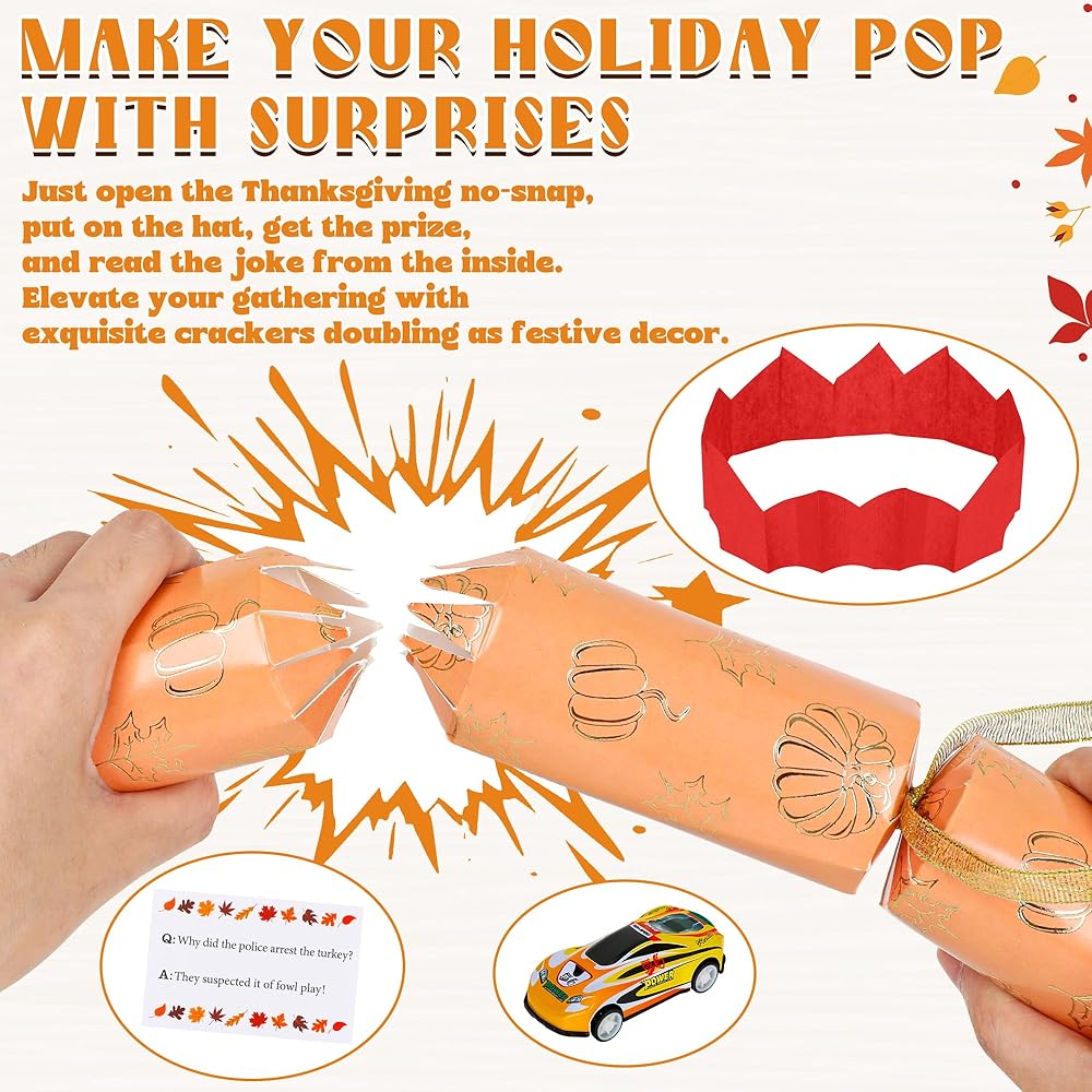Charming Revelations: Pull apart the ends of our Thanksgiving gifts to discover delightful treasures! These enchanting Thanksgiving party crackers serve as both festive entertainment and Thanksgiving table decor, fostering a lively ambiance that will be cherished throughout the holiday season