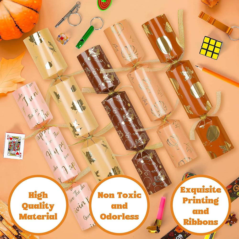 Distinctive Design: Each Thanksgiving cracker is filled with exciting surprises, including a paper crown, jokes, and playful toys like poker cards or magic cubes. With 15 charming prizes in total, these Thanksgiving crackers with prizes make every family member's dream of unexpected treats a reality