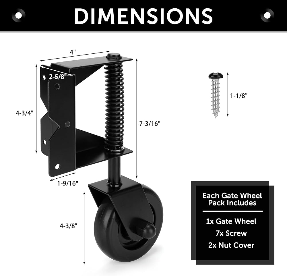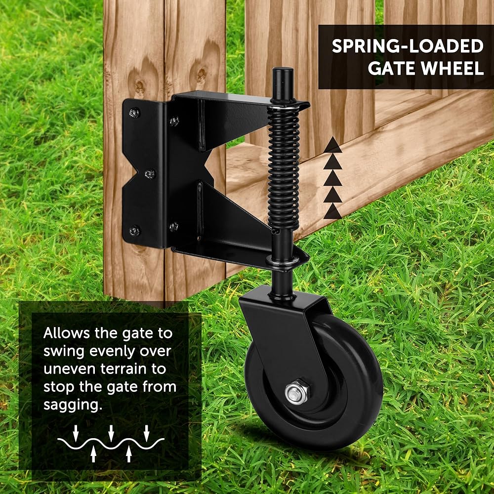 【Effortlessly to Swing with Spring-Loaded Gate Wheel】Upgrade your wood gate with our 4.3" gate wheel. Spring loaded feature allows wheel to adjust to uneven ground automatically to provide smooth and effortless movement. Easily open and close your gate with minimal effort, saving your time and energy, and stopping your gate from sagging.