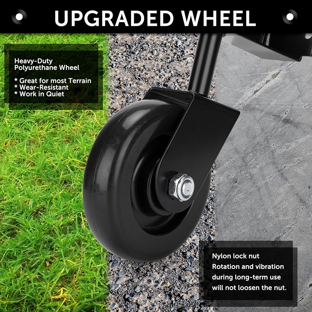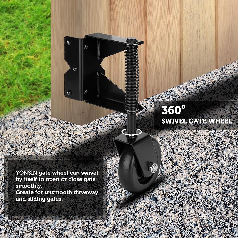 【Upgraded All-Weather Resistant Wheel】YONSIN black gate caster is made of premium material to offer great performance outdoor. The durable hot dipped galvanized black powder coat finish brackt, the heavy-duty polyurethane solid wheel with nylon lock nut, make gate helper wheel wear-resistant, moving quietly, and support gate weight up to 220lbs.