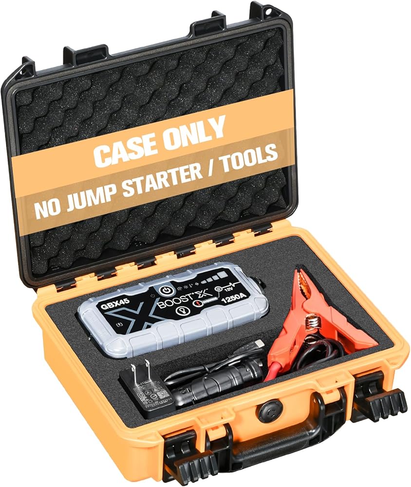 [Case for NOCO GBX45 Jump Starter Battery Booster Pack – Available in Black Base, Red Base & Orange Base]: Hard carrying case specially designed for NOCO GBX45 portable jump starter, lithium battery booster, and power pack. Features three color options—black bottom, red bottom, and orange bottom—so you can choose your preferred look. Large compartments store the jump starter, fast charger, car charger, cables, manuals, and accessories, keeping everything organized and secure for car emergency use