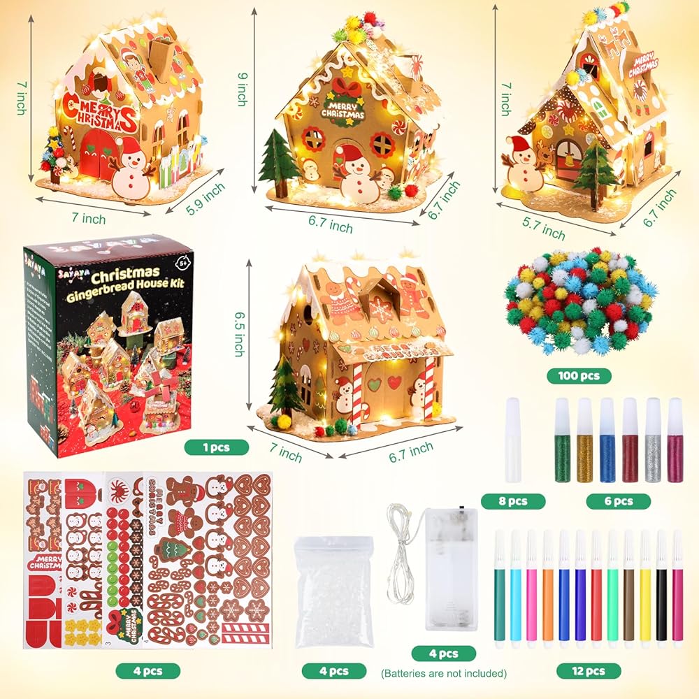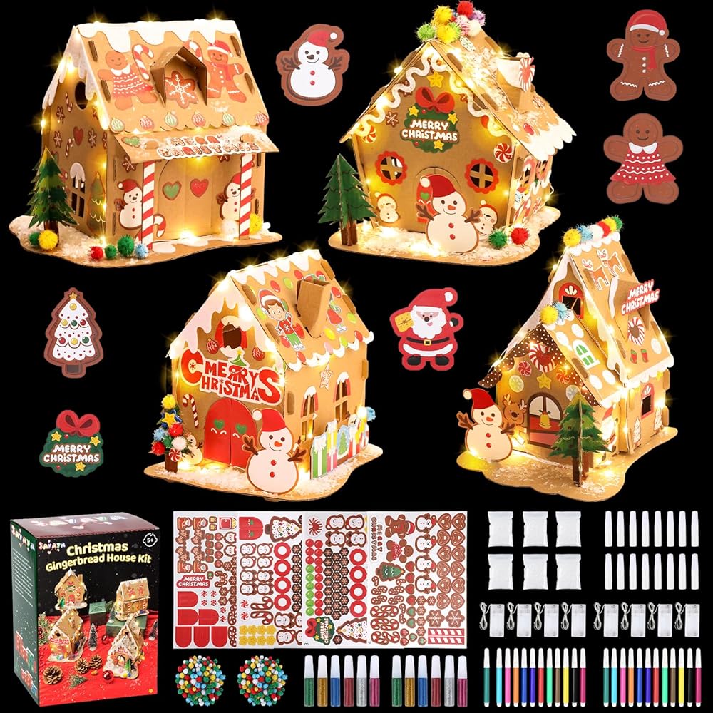 SAYAYA 4 Sets LED Cardboard Christmas Gingerbread House Kits Bulk DIY Your Own Christmas Gingerbread House with Pom Poms, Stickers, Light Strings, Pens Craft Kit for Xmas Holiday Party Decorations