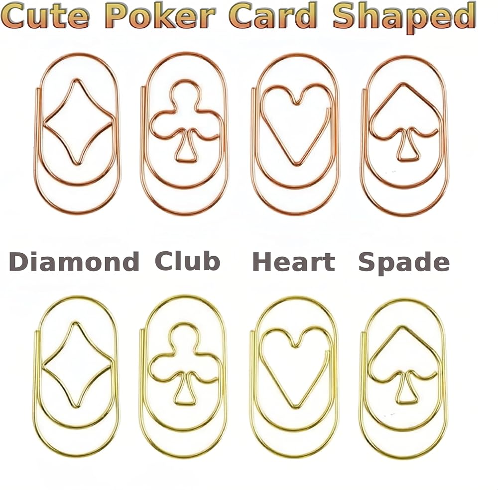 Add a touch of fun and creativity to your everyday paperwork with these poker shape paper clips. This set includes 40 cute decorative clips in 4 different designs – spade, heart, club, and diamond – available in both gold and rose gold finishes. Each paper clip measures 1.42" x 0.79", making it the perfect size for securing documents, organizing planners, or bookmarking your favorite books. Crafted from durable alloy with a smooth polished surface, these clips are strong, reusable, and gentle on paper. Their shiny metallic colors bring a stylish look to office documents, school assignments, scrapbooks, and invitations. Beyond daily use, they also make unique decorative clips for weddings, parties, and creative projects. These poker paper clips are easy to carry, store, and gift. Whether for office supplies, school stationery, or fun desk accessories, these cute and functional clips bring joy and practicality to your workspace.