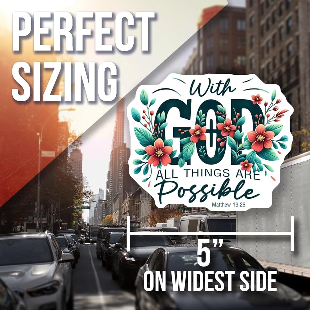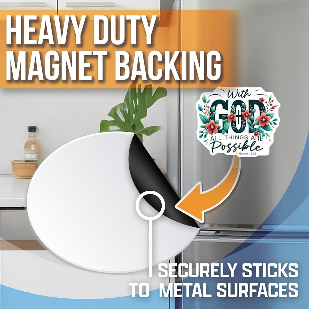 This inspirational "With God All Things Are Possible" magnet featuring Matthew 19:26 is a beautiful addition to your home decor. It's perfect for placing on your refrigerator, locker, or workspace, reminding you daily of your faith and the limitless possibilities with God. The vibrant floral design around the quote adds a lovely touch. Ideal as a thoughtful gift for friends, family, or yourself to inspire and uplift.