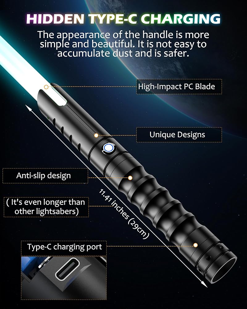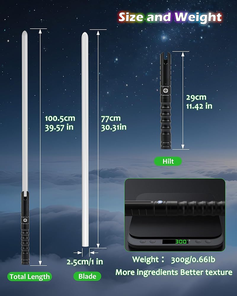 A more substantial hilts - 1-inch high-strength blade. Unlike all kids light sabers on the market, we've upgraded the hilt with a heavier feel. 300g makes it feel more substantial in your hand. We have upgraded the aluminum alloy hilt. The hilt has a high quality oxidized finish to increase friction without slipping and more textured, and at 11.41 inch(29cm) in length, it's even longer than other light saber