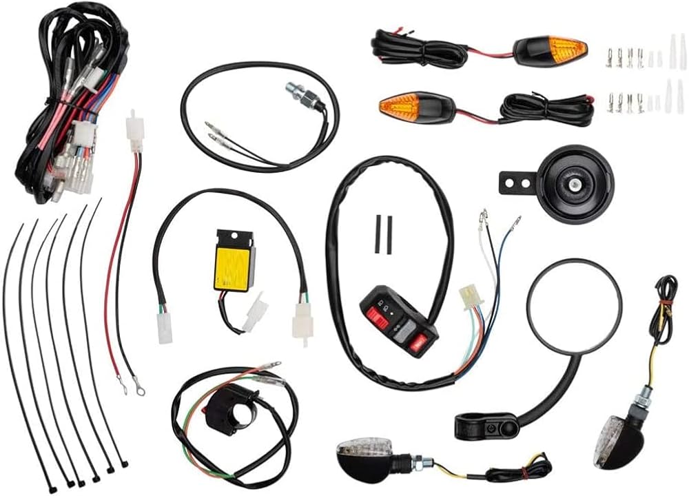 Kit comes complete with wiring harness, LED mini-stalk front turn signals, LED flush mount rear turn signals, flasher relay, horn, hydraulic brake switch, LED taillight/brake light, dual sport folding mirror, On/Off switch, and control switch