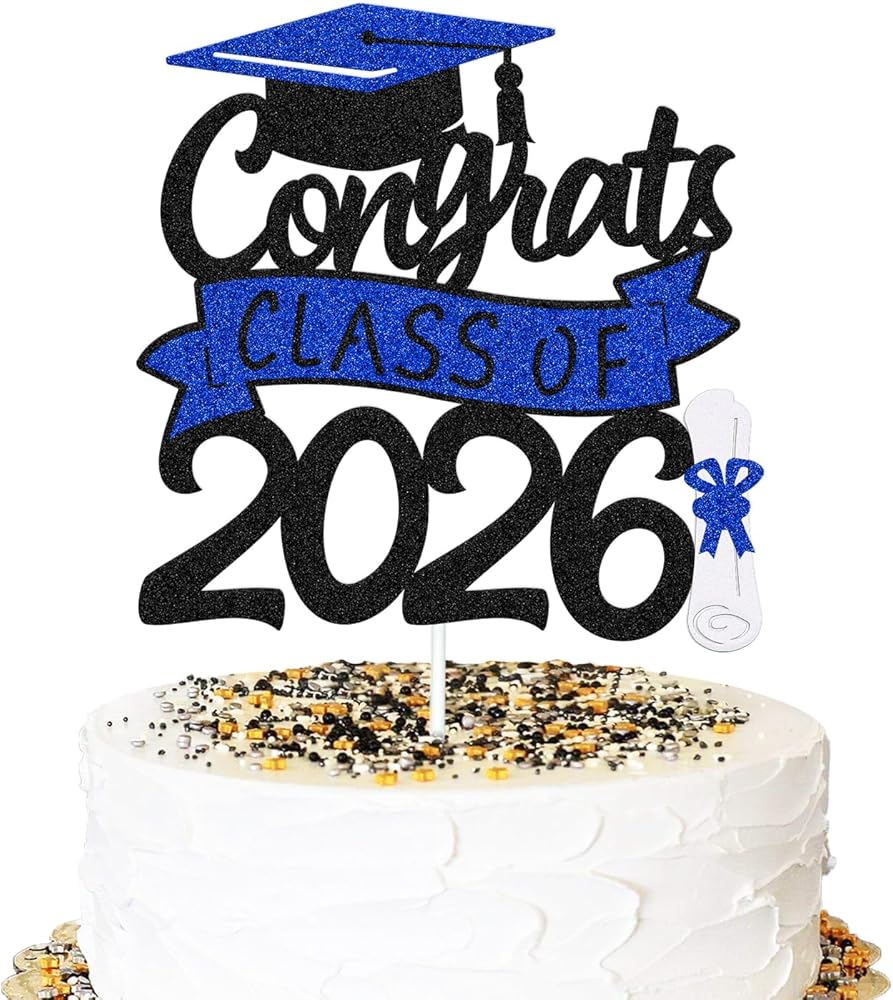 Congrats Class of 2026 Cake Topper Congrats Grad Cap Diploma Theme for High School Happy Graduation Party Supplies College Graduate Decoration (Black and Blue)