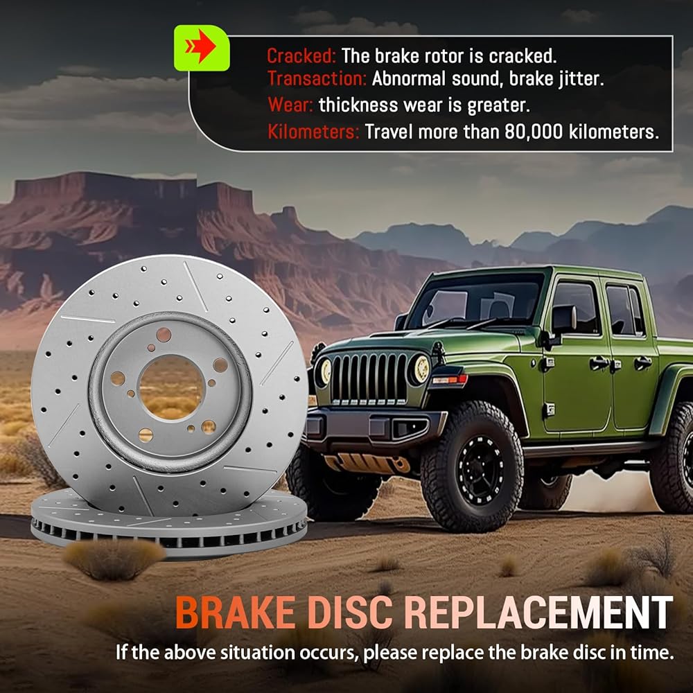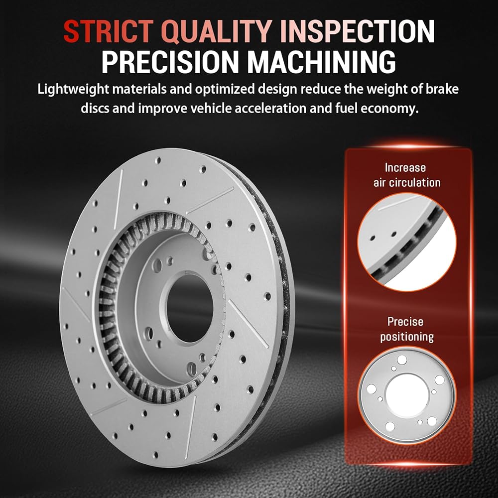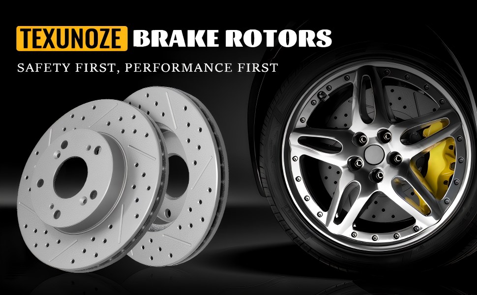 【Excellent Braking Effect】 Texunoze's drilled and slotted brake rotors set increase the number of points of contact between the disc and pads, which increases friction, improves braking efficiency, and reduces wear on the braking system for longer service life