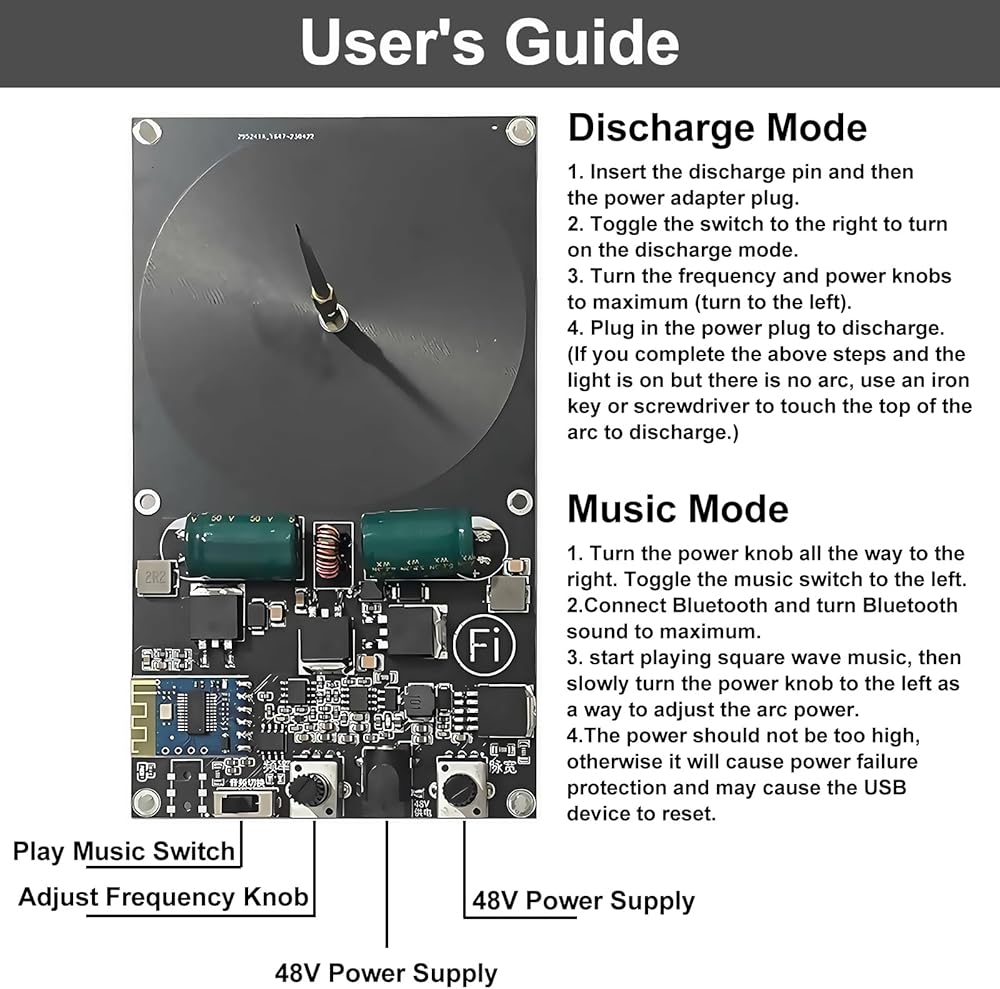 First, turn the pulse width knob all the way to the right, then turn the switch to the left, and connect Bluetooth to maximize the sound. Start playing square wave music, and then slowly turn the pulse width knob to the left to adjust the arc power. Be careful not to use too much power, otherwise it may cause the protection to lose power.