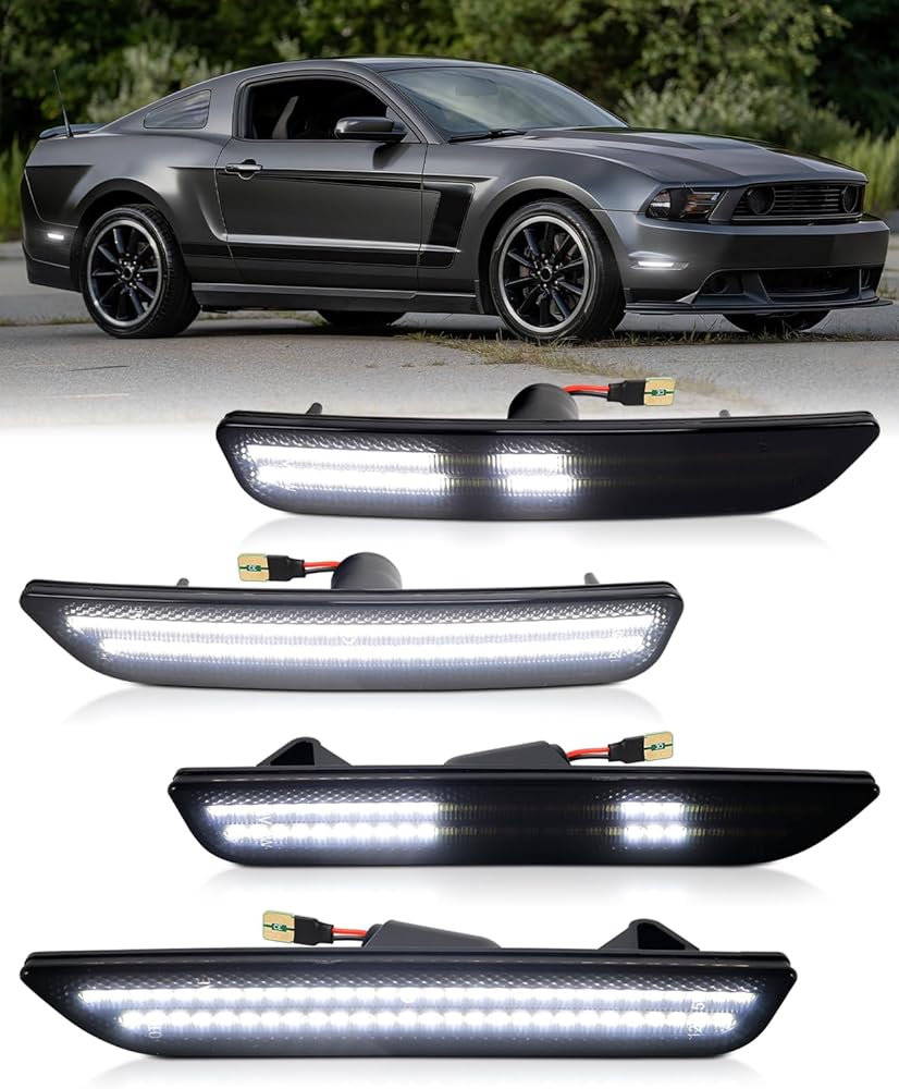DURABLE MATERIAL: Smoked lens side markers for ford mustang 10-14 adopts with high quality PC lens & black housing for both driver and passenger side; Features IP67 waterproof and scratch resistant; No faded with long-time exposure on all kind of extreme weather