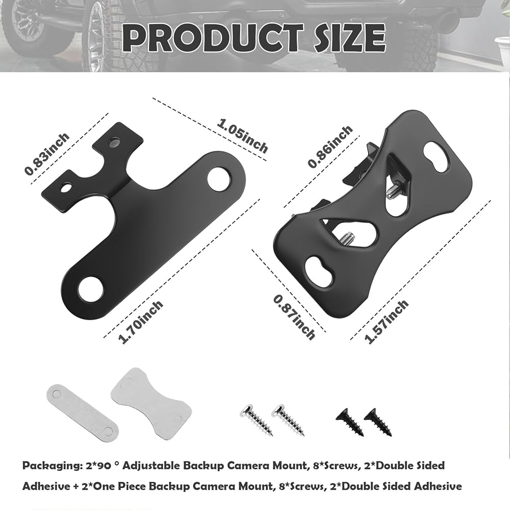 Packaging: 2*90 ° Adjustable Backup Camera Mount, 8*Screws, 2*Double Sided Adhesive + 2*One Piece Backup Camera Mount, 8*Screws, 2*Double Sided Adhesive