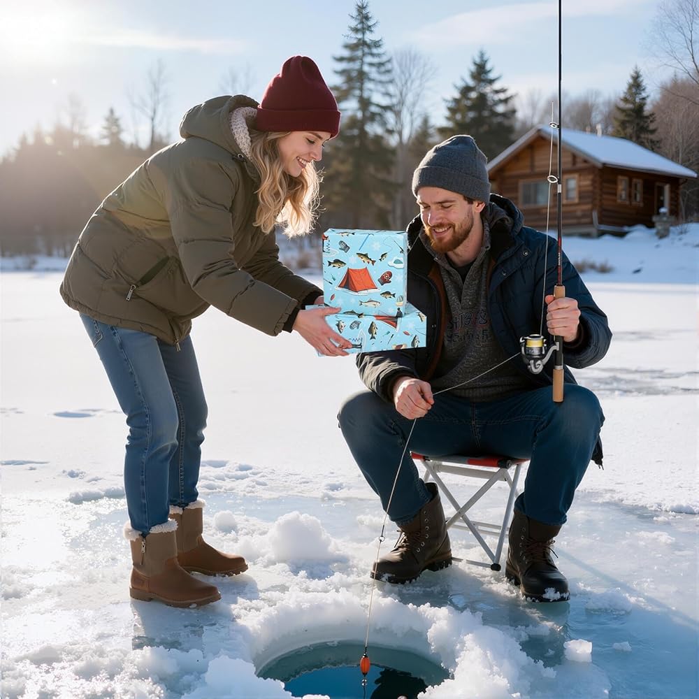 • Eye-Catching Ice Fishing Design: Our wrapping paper features a charming and vibrant design that captures the excitement and beauty of ice fishing. Such as fishermen, ice fishing tents, jumping fish, fishing rods, ice cones, winter hats, gloves, and delicate snowflakes