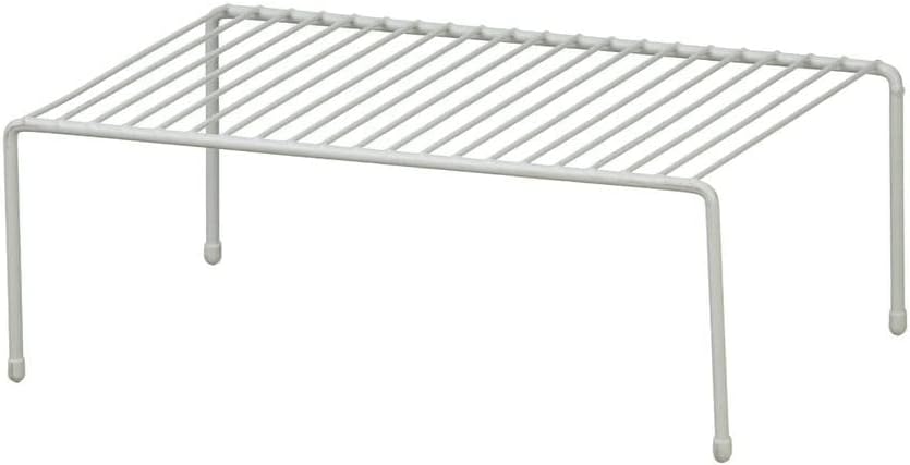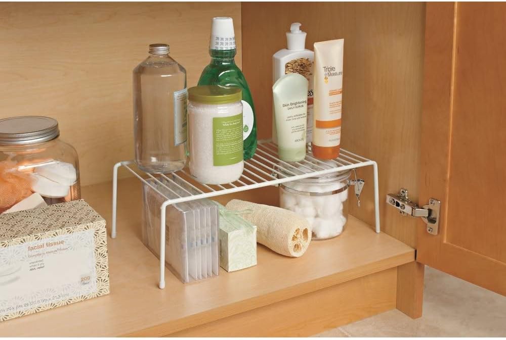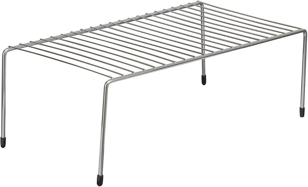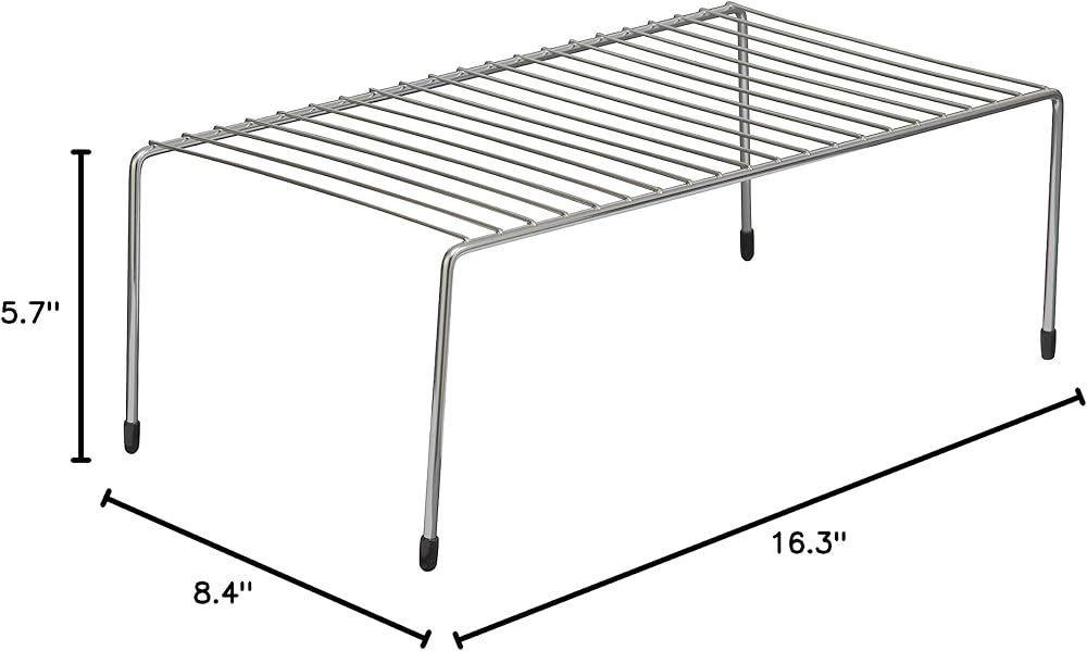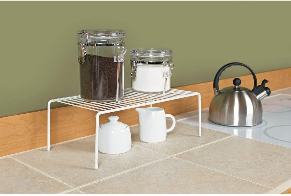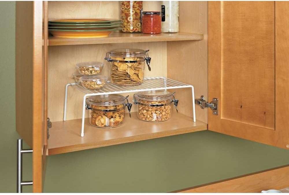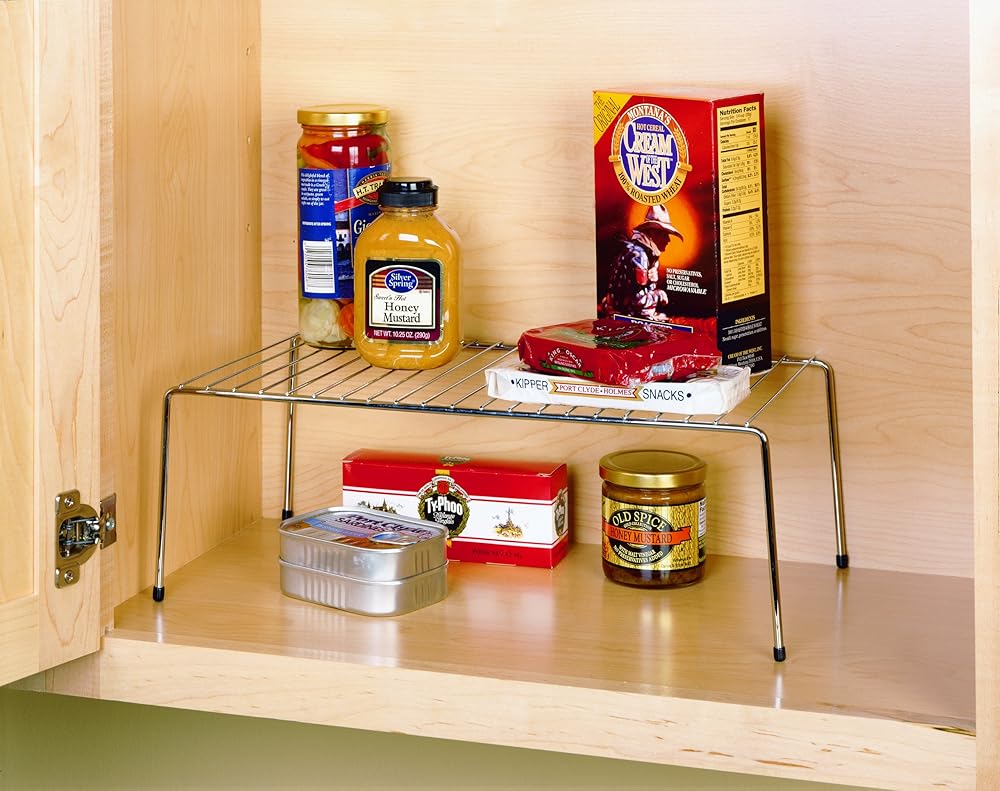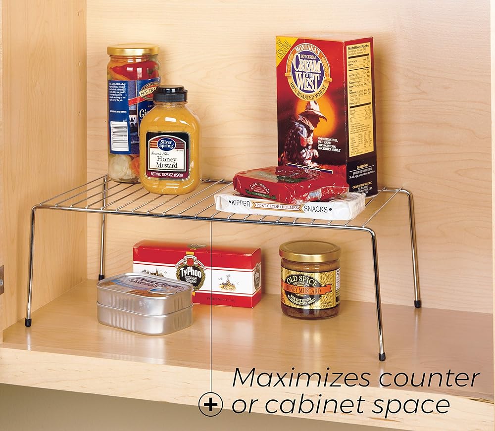 Stack extra tiers of dishes, canned goods or containers in kitchen cabinets with this versatile shelf