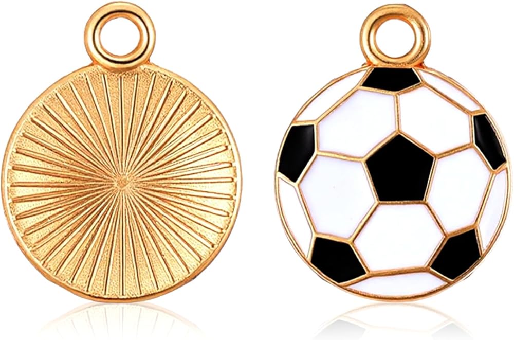 【Authentic Football Design】Each soccer ball charm replicates the iconic hexagonal pattern of professional footballs. These precisely crafted soccer ball charms measure 1.6x1.3cm/0.63x0.51in with secure 1.8mm hanging holes, making them ideal soccer charms for bracelets and necklaces. The gold-plated zinc alloy construction ensures lasting shine and durability