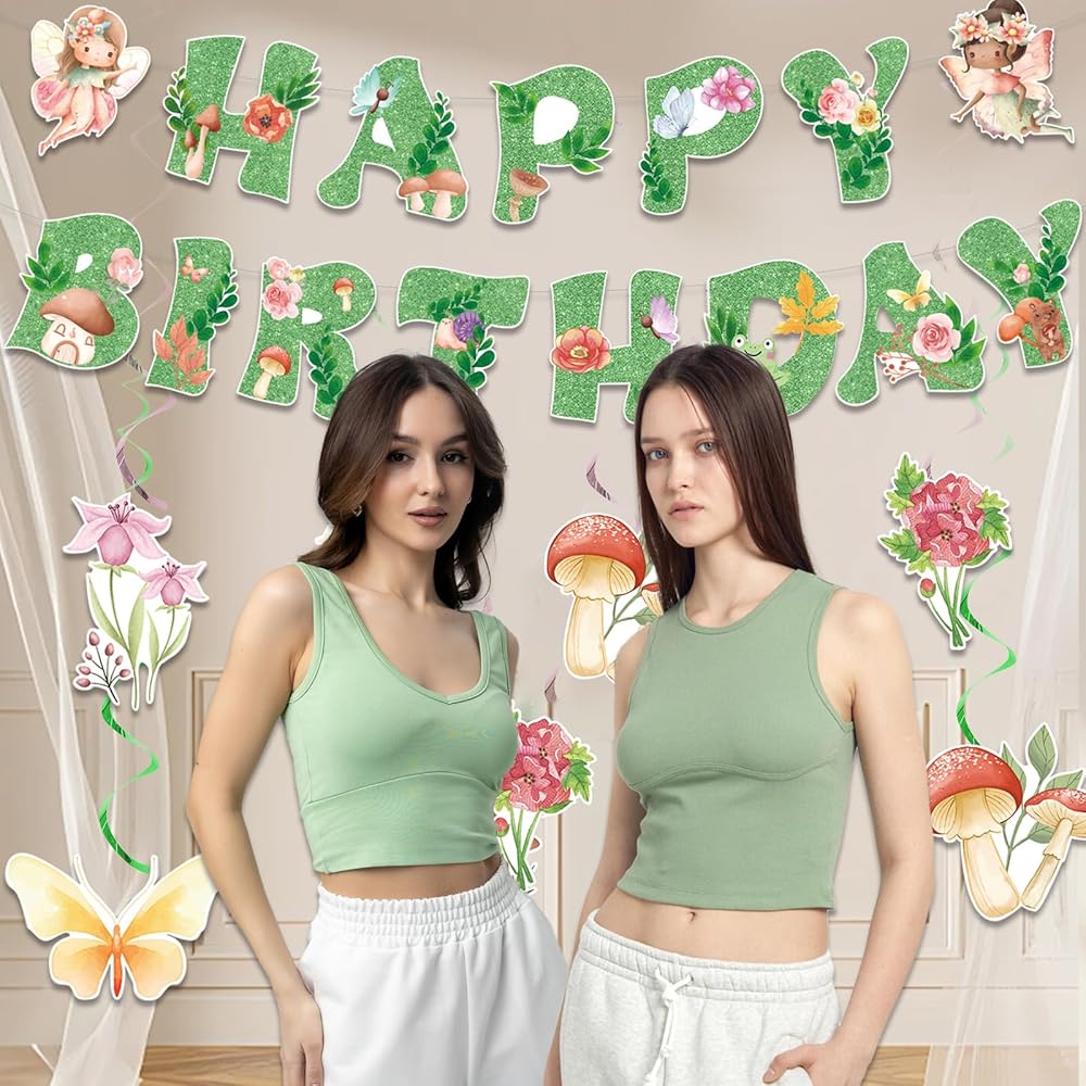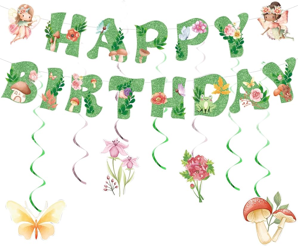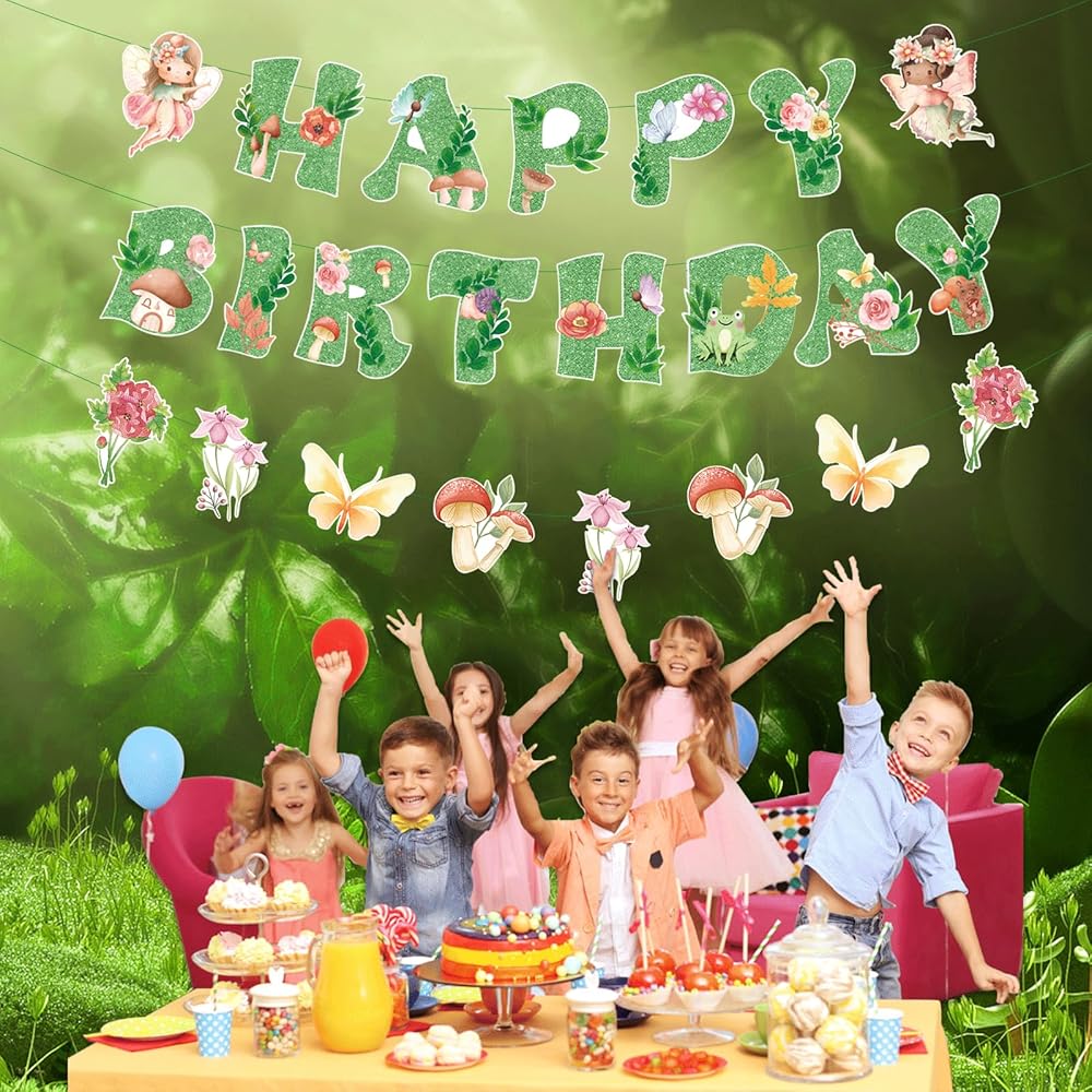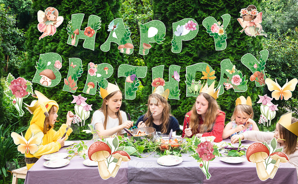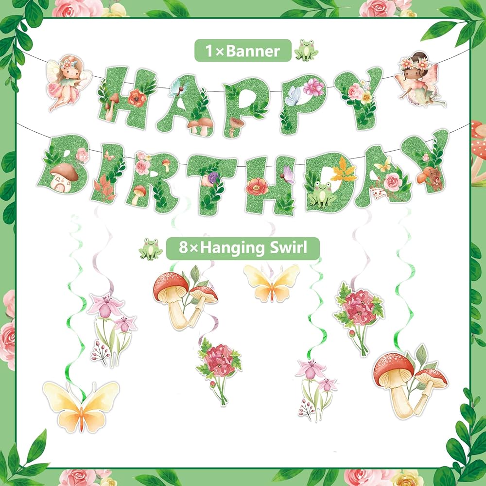 【Green Fairy Birthday Party Decorations】Transform any space into a magical fairy garden with this 9-piece glittery green fairy decoration set. Includes 1 "Happy Birthday" banner (13 letters) with 2 butterfly fairy cutouts, and 8 whimsical mushroom & flower decorations—perfect for fairy first birthday parties or enchanted garden celebrations!