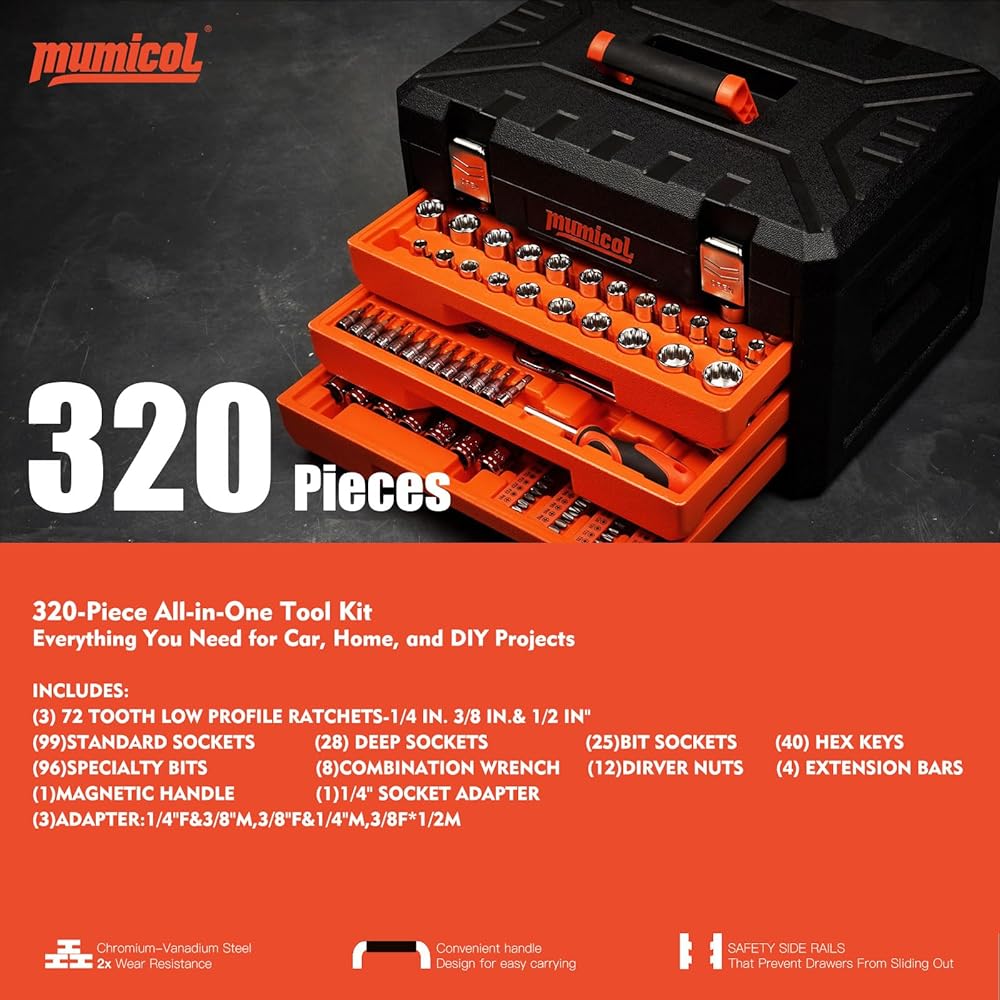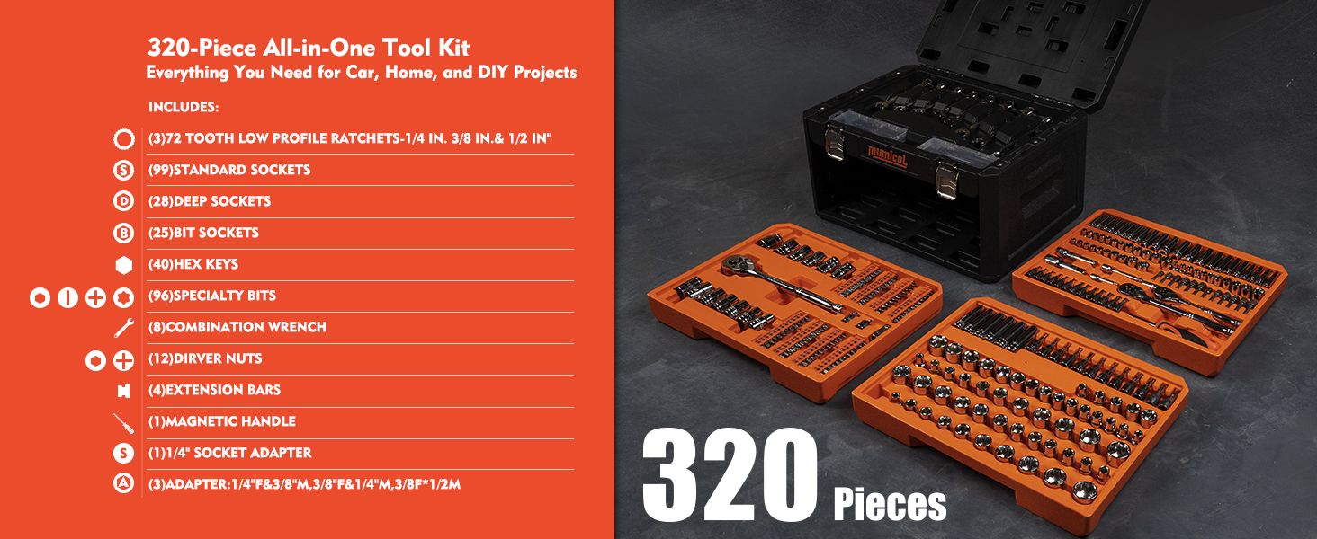 COMPLETE 320-PC Mechanical Tool SET: Includes 1/4”, 3/8”, and 1/2” drive sockets (SAE & Metric), deep & standard sockets, ratchets, extensions, adapters, combination wrenches, hex keys, screwdriver bits, and magnetic handle. Ideal for auto repair, DIY projects, and home maintenance.