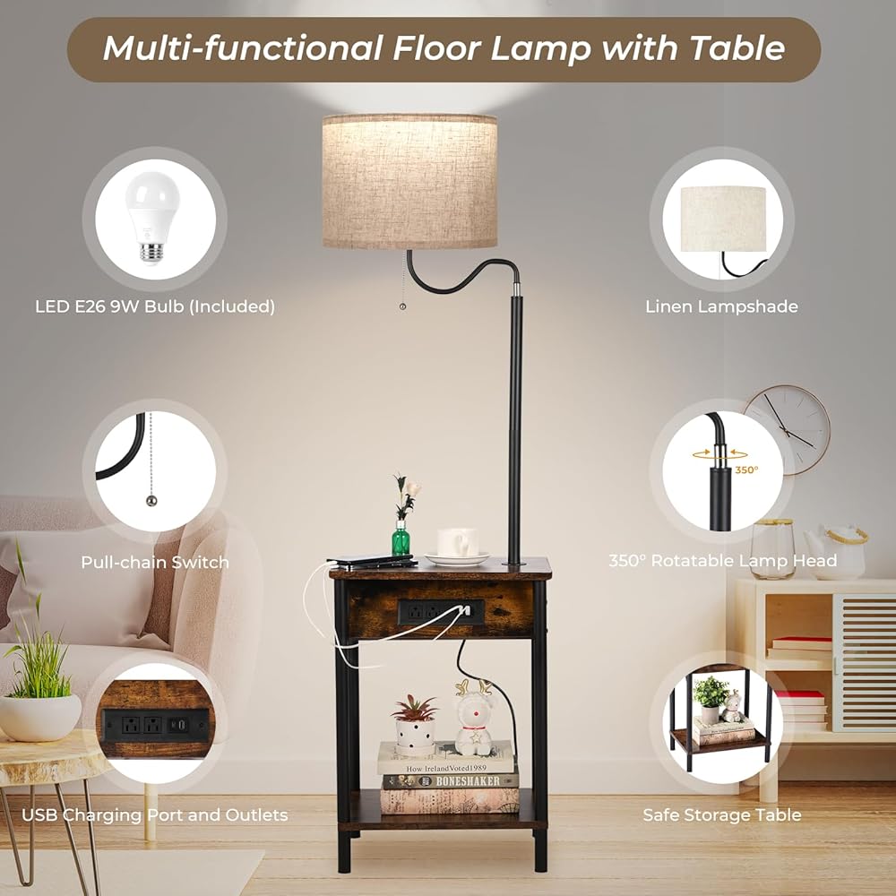 FIMEI Floor Lamp with Table, End Table with Charging Station USB Ports & Outlets, Bedside Table 3 Color Temperature Reading Light, Nightstand with Shelves for Living Room, Bedroom, Apartment