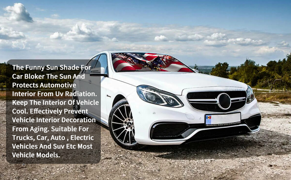 【Unique Design】 This windshield shade for car featuring an eye-catching flag and American Eagle Flag pattern adds interest to your car, keeps it looking stylish and makes your journey more enjoyable