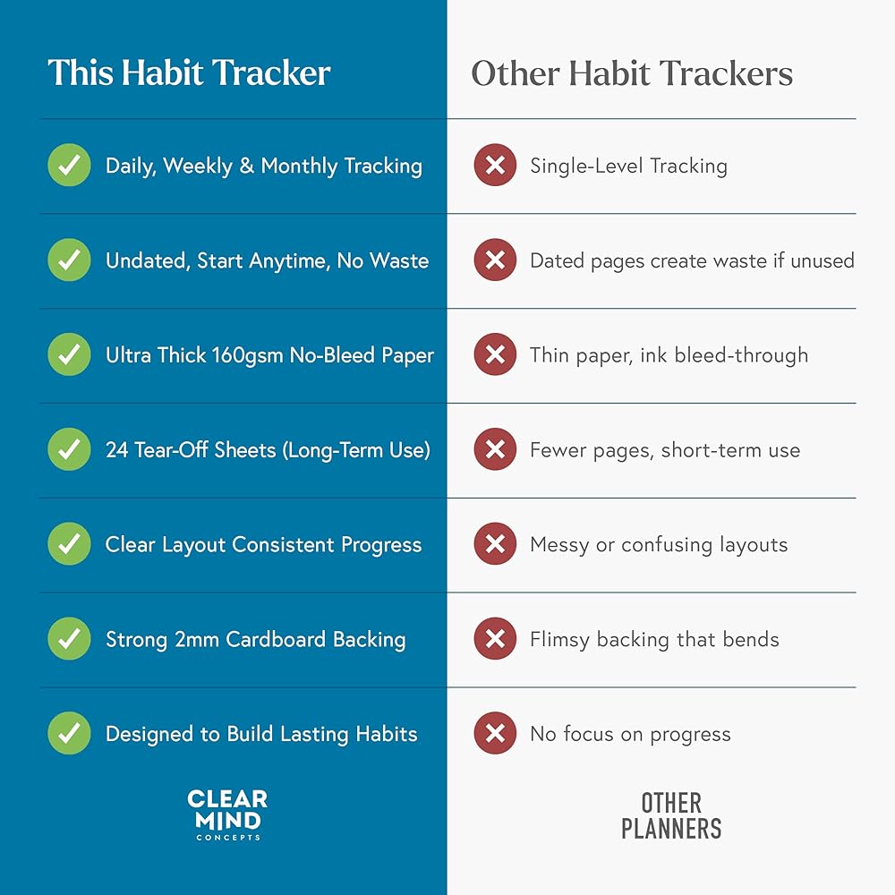 Introducing the Habit Tracker Hero Desk Pad by Clear Mind Concepts—your ultimate tool for cultivating positive habits and staying organised. This A4-sized desk pad features 24 undated, tear-off sheets made from premium 160gsm thick paper, ensuring a smooth writing experience without ink bleed-through. Each sheet offers over 30 days for habit tracking, along with dedicated weekly and monthly sections to help you plan and reflect. Perfect for setting goals and monitoring progress, this planner keeps your aspirations front and centre, motivating you to achieve your best every day.