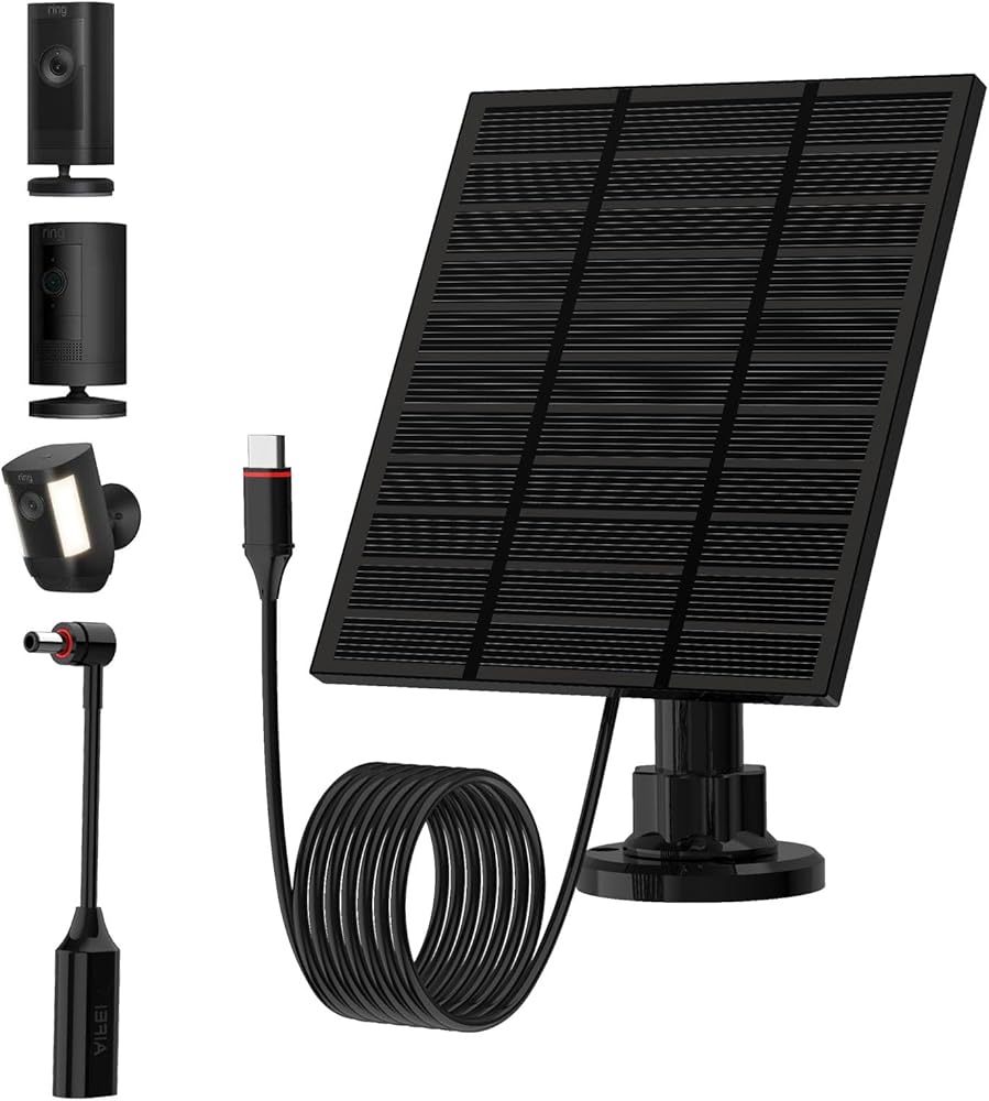 【High-Efficiency Ring Camera Solar Panel】This 5W monocrystalline solar panel for Ring camera provides continuous green energy for your Ring Spotlight Camera and other models like Stick Up Cam Pro, and Outdoor Cam Plus. As dedicated Ring solar panels for outdoor cameras, they ensure you never worry about battery drain again.