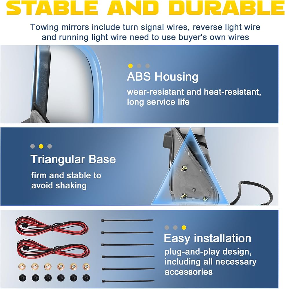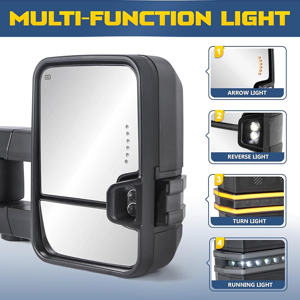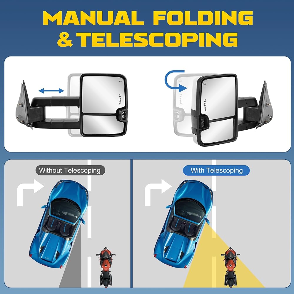 [ Package Includes ]: A pair of towing mirrors (both driver and passenger side) + turn signal wire + mounting screws. Easy Installation, No Modifictaion.(Professional installation is highly recommended).