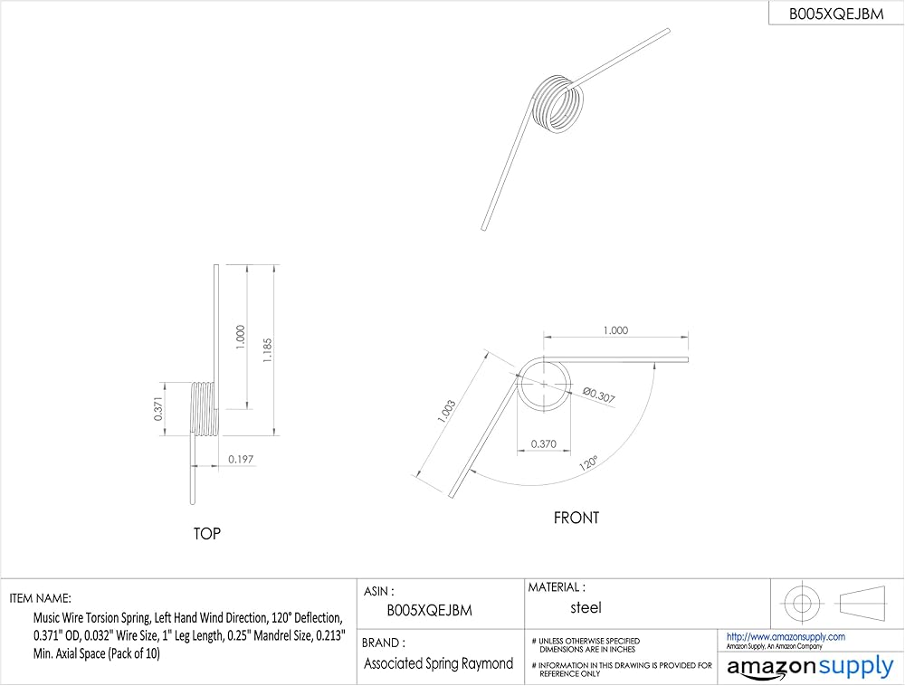 Music Wire Torsion Spring, Left Hand Wind Direction, 120° Deflection, 0.371" OD, 0.032" Wire Size, 1" Leg Length, 0.25" Mandrel Size, 0.213" Min. Axial Space (Pack of 10) in Kuwait Music Wire Torsion Spring, Left Hand Wind Direction, 120° Deflection, 0.371" OD, 0.032" Wire Size, 1" Leg Length, 0.25" Mandrel Size, 0.213" Min. Axial Space (Pack of 10) in Kuwait