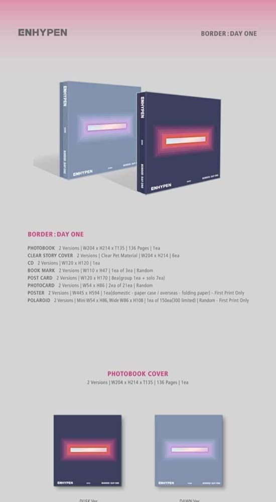 BE:LIFT Ent Enhypen Border : Day One 1st Mini Album Dawn Version packages includes CD+136p PhotoBook+Clear Story Cover+1p Bookmark+2p PhotoCard+1p PostCard +Free Tracking Number. Folded Poster may NOT be included. Pre-Order benefit is randomly included inside some of the first press albums(Only 300ea). Depending on versions , contents inside the album may differ. Message Photocards Set will be randomly selected from any kpop group and included. "Officially distributed Brand New & Factory Sealed CD." "Your purchase quantity will be count on Korea HANTEO & GAON Chart!" Track List Disk(CD) 1. We will be updated soon...
