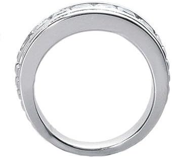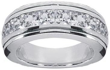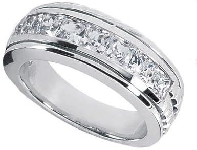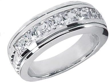 Diamonds aren't just for her on your wedding day and you can afford to have these magnificent gems in your ring too because our low wholesale direct prices allow you to have that flashy ring without spending all your pennies. Here we've made a diamond band featuring splendid princess cut diamonds set in a channel across this luxurious in 14 kt white gold ring. These stones are carefully matched for superior cut and top quality G white color and SI-1 eye clean clarity. The total weight of 1.50 carat rests beautifully in this handcrafted ring with splendid comfort fit rounding for a smooth feel on your hand.