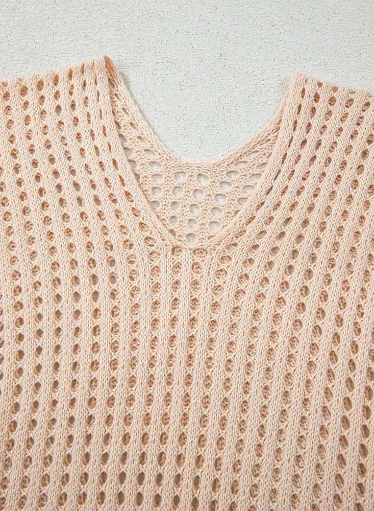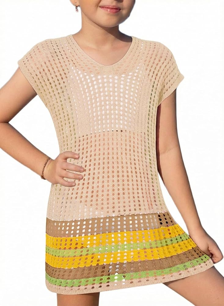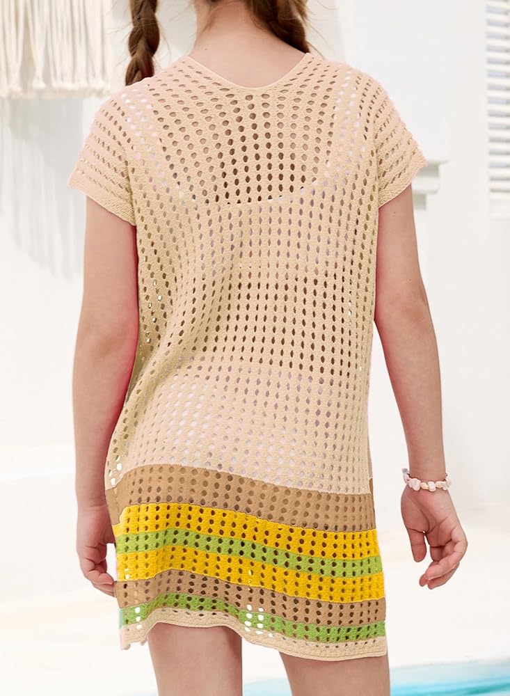 Chic Beach Cover Up: Girls swim cover up features a colorblock slit hem and delicate crochet hollow-out detailing. With a flattering V-neck and short sleeves, tween girls swimsuit is a stylish girls beach dress that offers modest and full coverage