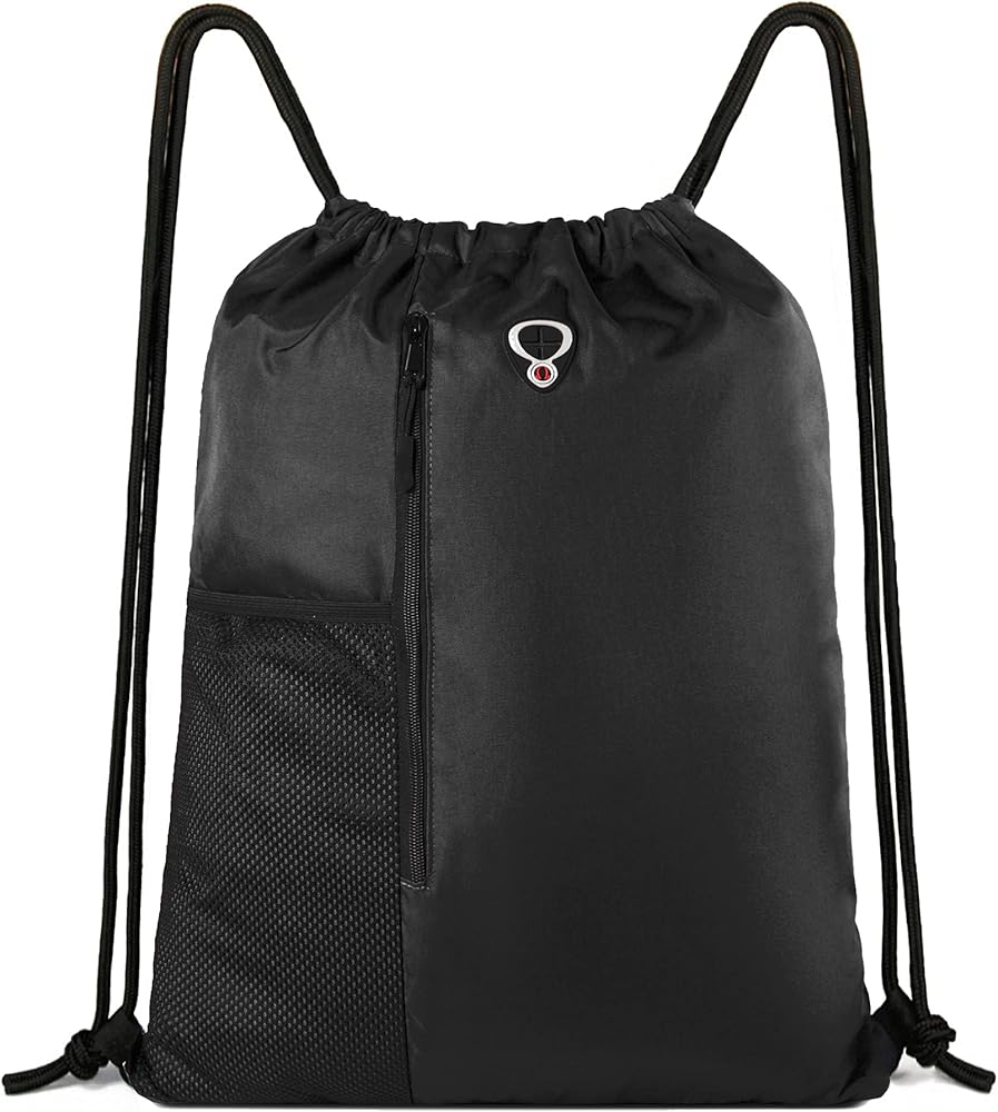 CONVENIENT COMPARTMENTS: The big shoe compartment on the right side of gym drawstring backpack can hold two pairs of shoes. The front zipper pocket is roomy to fit a kindle, iPad, sunglasses, and other small items. The inside pocket can hold small valuables such as wallet, cellphone, keys to avoid any pickpockets. And two mesh pockets can carry water bottles, umbrella, sunscreen. Etc.This black drawstring backpack also can be used to store small items.