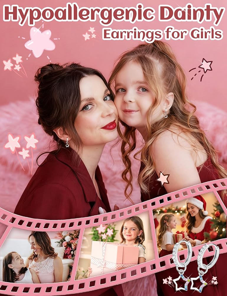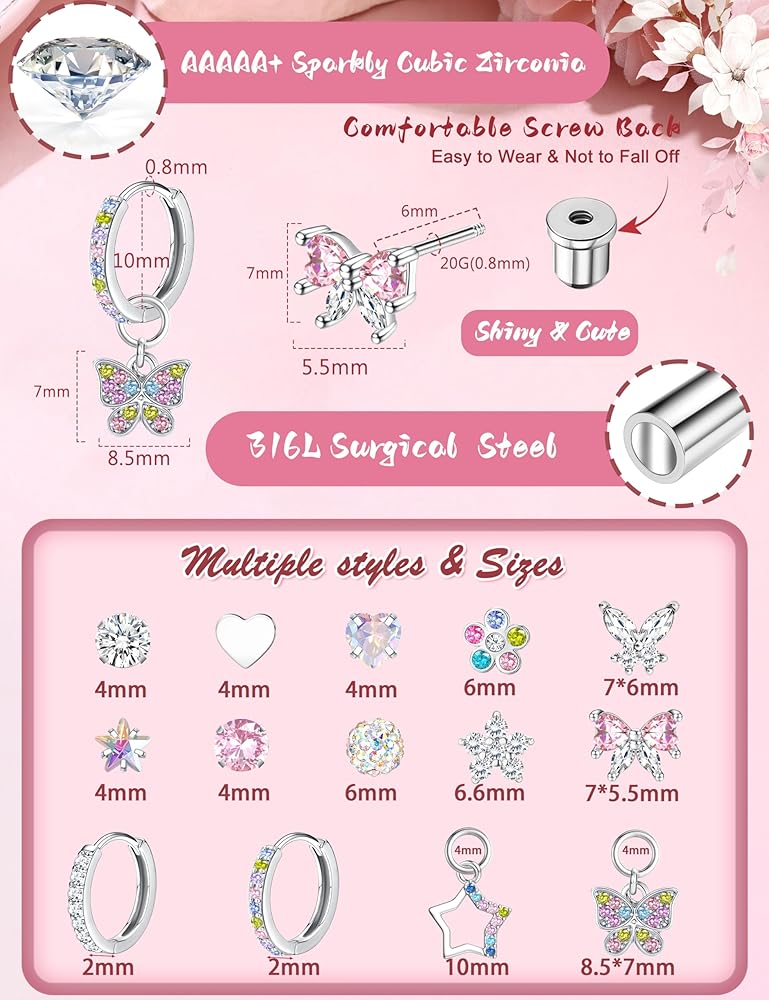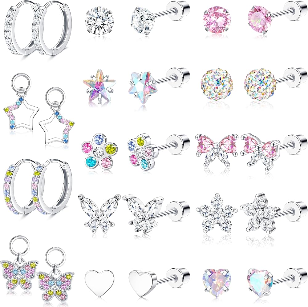 Toddler Earrings Set : Come with 12 pairs earrings for girls and women, including 10 pairs screw back earrings and 2 pairs small hoop earrings. With butterfly, heart, ball, star and flower elements, these kids earrings provide more options to any outfit. The vibrant cubic zirconia adds a lively touch of colour to your outfits, elevating your everyday style