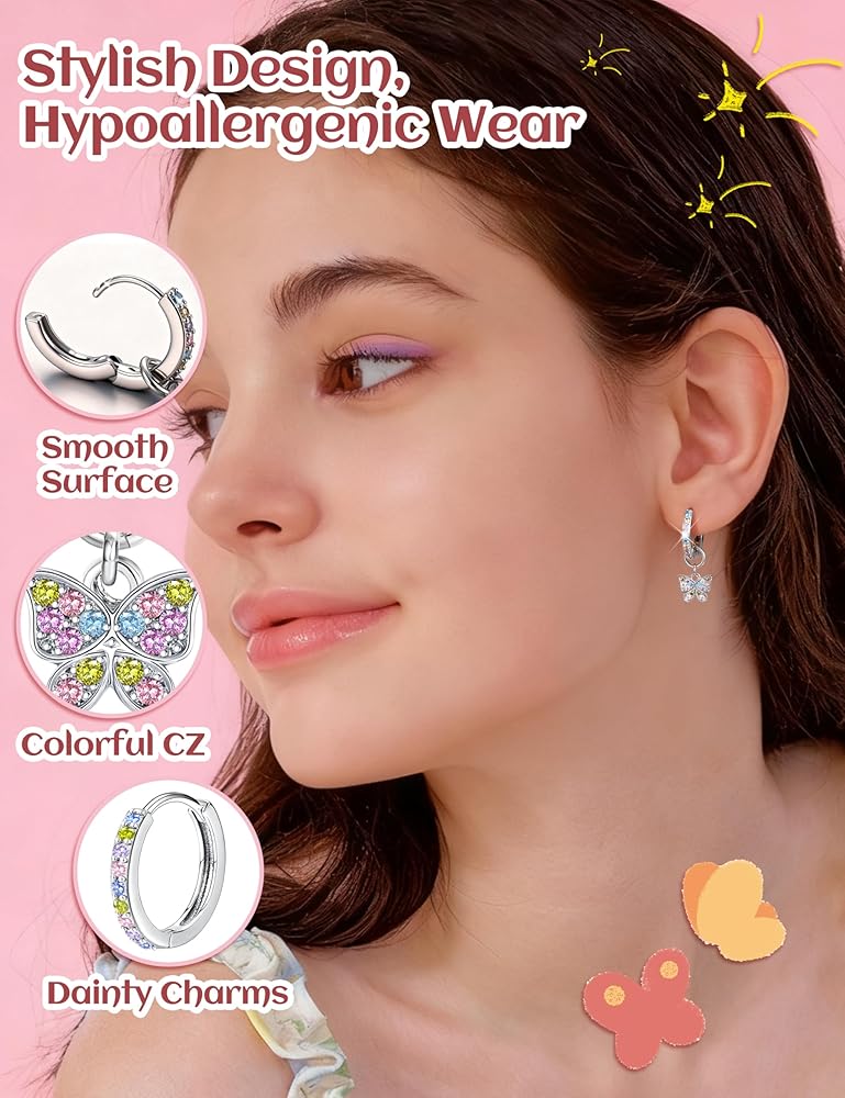 Girls Hoop Earrings with Charm: With 2 pairs interchangeable CZ charms that easily install, the girls earrings pack encourages children's creativity. These cute earrings meet toddler's DIY need, you can wear them as dangle earrings or huggie hoop earrings. Mix and match the girl earrings freely to create a personalized look