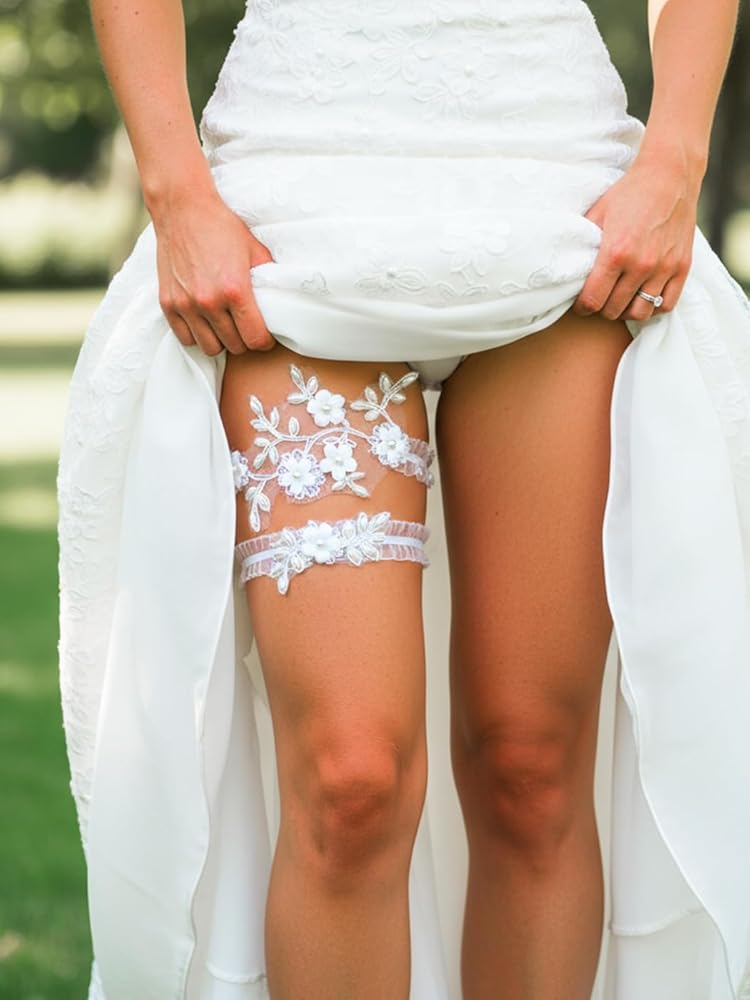 - Elegant lace garters classic white color and intricate floral pattern make this set a stunning addition to any bride's wedding day ensemble