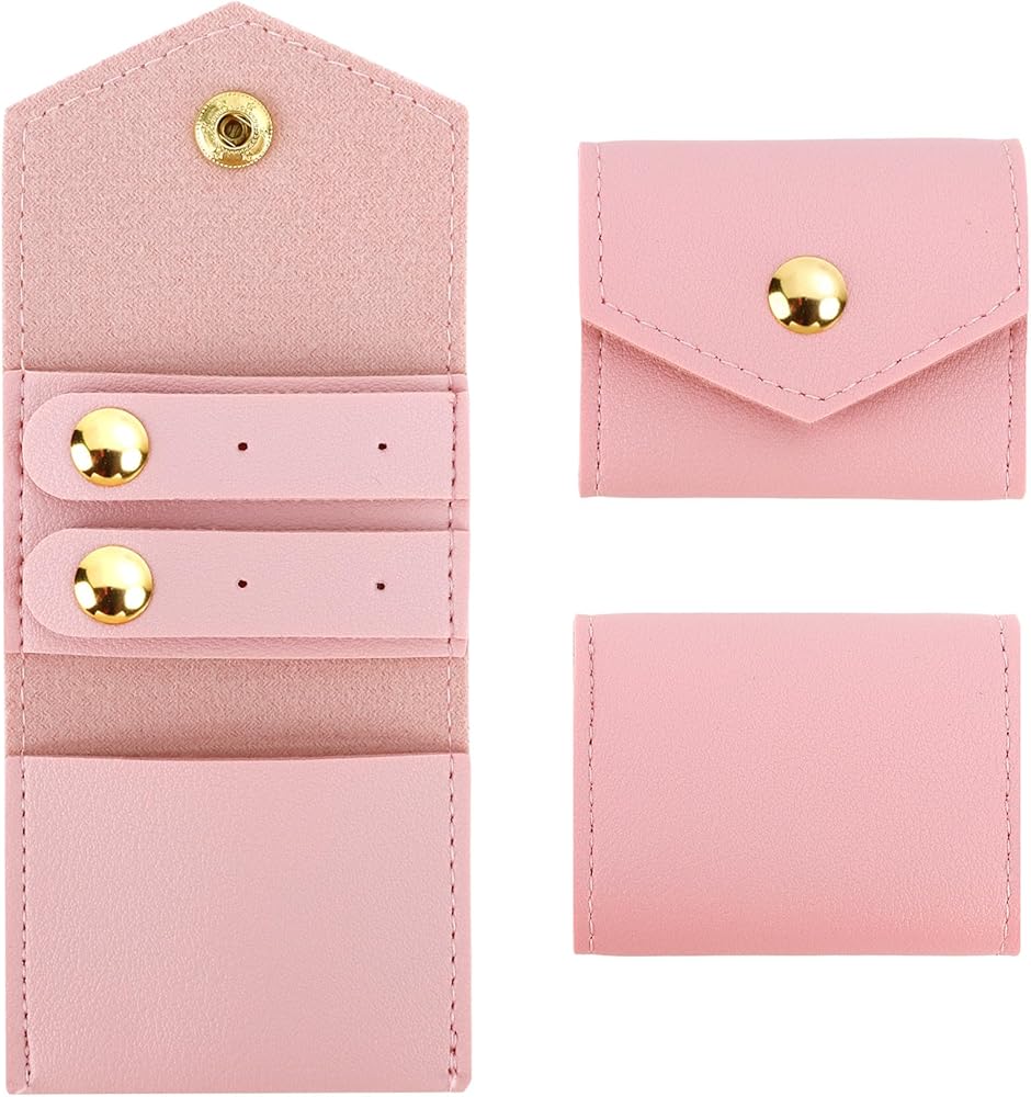 Pink Mini Travel Jewelry Bag Foldable Small Size Portable Leather Ring Case Earring Pouch Soft Organizer Tiny Traveling Jewelry Rolls Zippered Pocket Case Stocking Stuffers Gifts for Women Girls