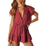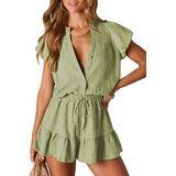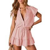 Stylish V-Neck Design: Women's short-sleeve V-neck button down romper with a chic, flattering neckline, perfect for casual dailywear