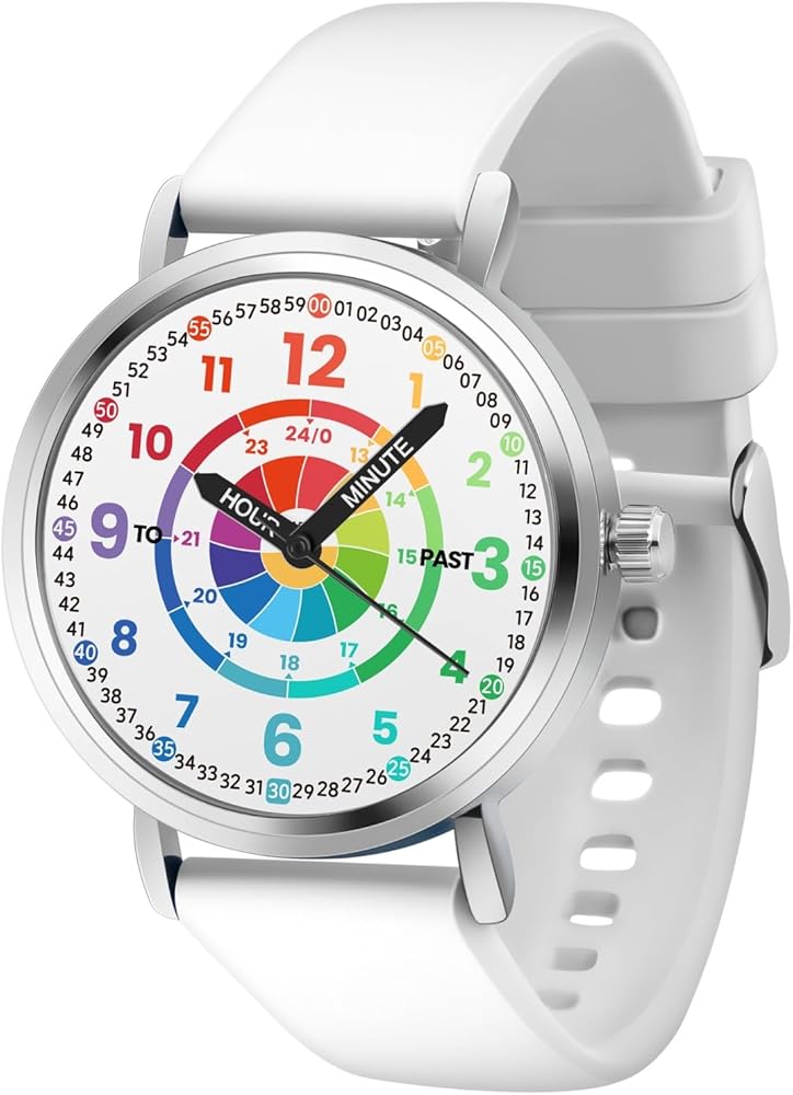 EASY & JOYFUL OF TIME LEARNING: Time teaching watch is designed to help kids learn how to tell the time quickly and effectively. Kids analog watch keeps them engaged and interested in learning how to read the time. RECOMMENDED AGE: For children from 5 years old, suitable for everyday use. 33mm Dial diameter fits perfect for children's wrist. COMFORTABLE & ADJUSTABLE: Colorful Silicone band and funny dial make it a stylish wearer of your child. Adjustment holes on the strap to fit wrists large and small. WATER PROOF: Watches for kids are water resistant, so they can withstand splashes while washing hands or playing in the rain but should be removed before bathing or swimming. BEST GIFT FOR KIDS: It's a perfect gift for kids' Birthday, Graduation, Party Gift, and so on.